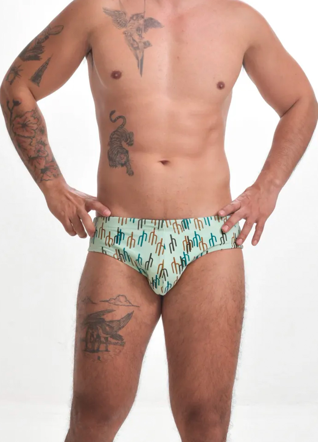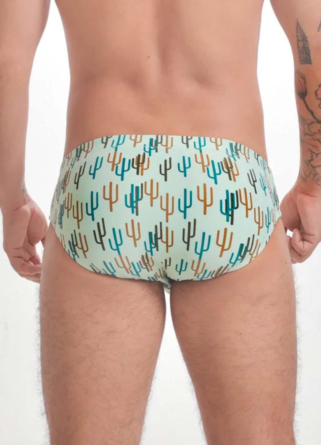 Este bañador presenta un diseño inspirado en el paisaje del desierto, con un patrón repetido de cactus estilizados en tonos verdes, tierra y azules sobre una base clara que aporta frescura visual. Su corte tipo brief ofrece un ajuste preciso que realza la silueta y permite total libertad de movimiento.