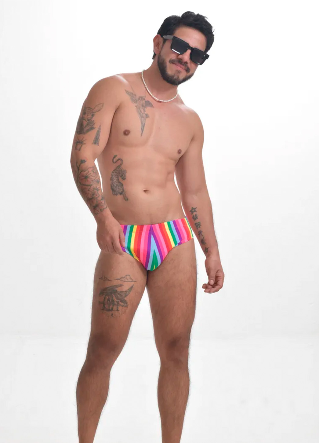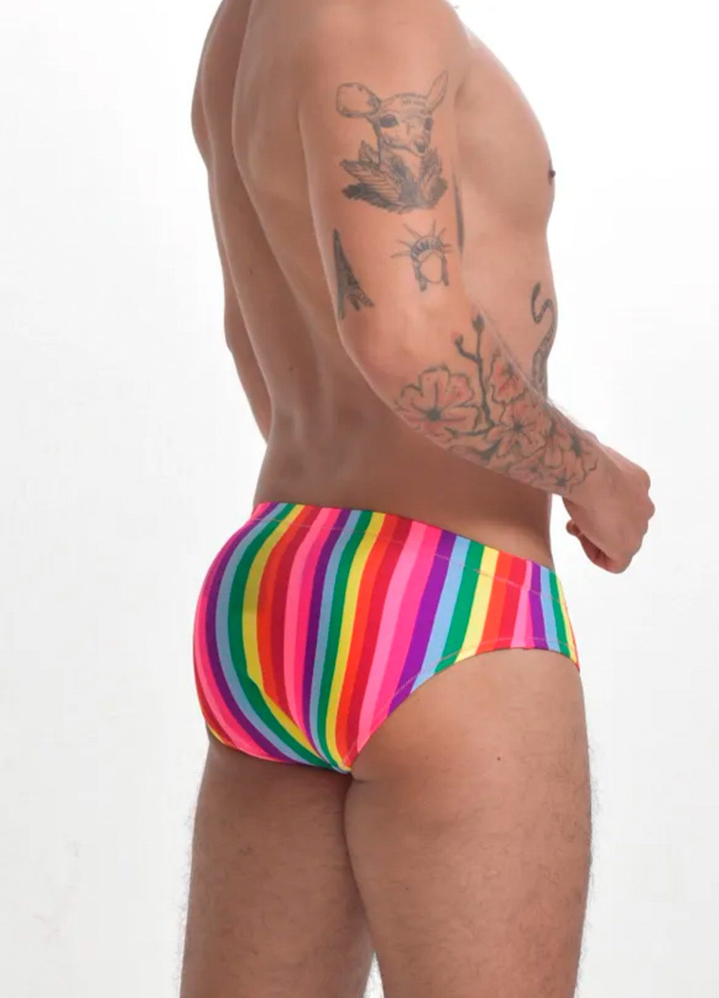 Este bañador tipo brief presenta un diseño llamativo con franjas verticales multicolor que aportan fuerza visual y una identidad clara. Su corte es anatómico y ajustado, ofreciendo un calce cómodo que se adapta al cuerpo de forma natural, brindando soporte y libertad de movimiento.