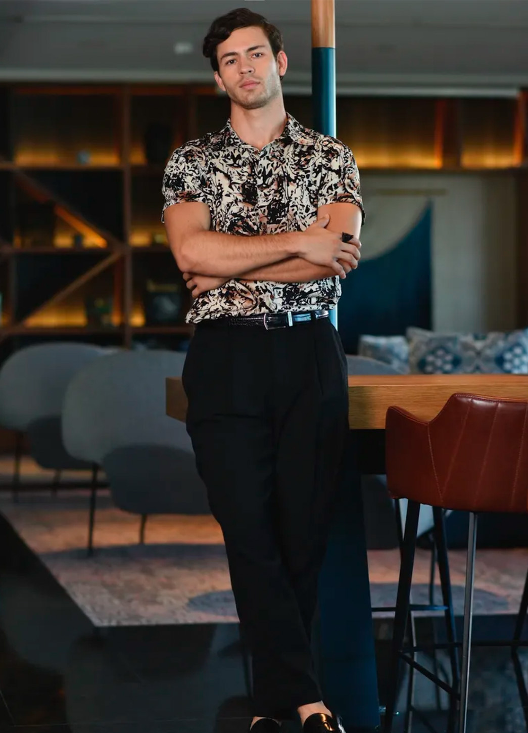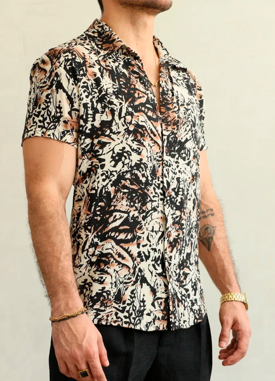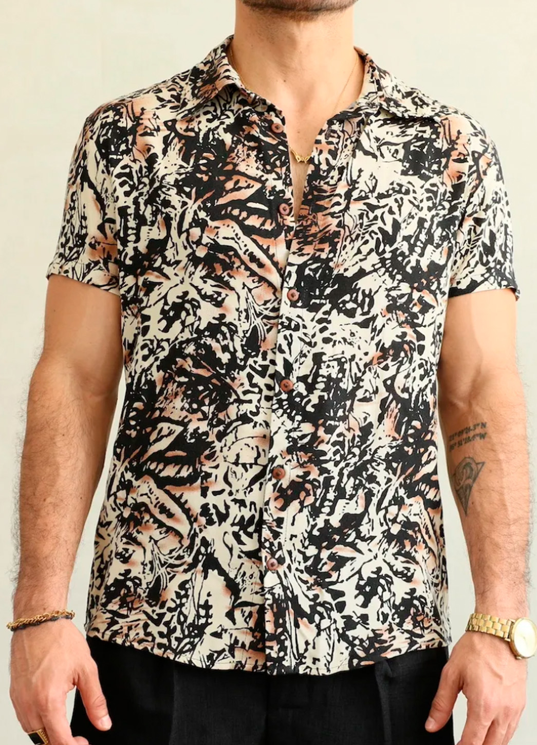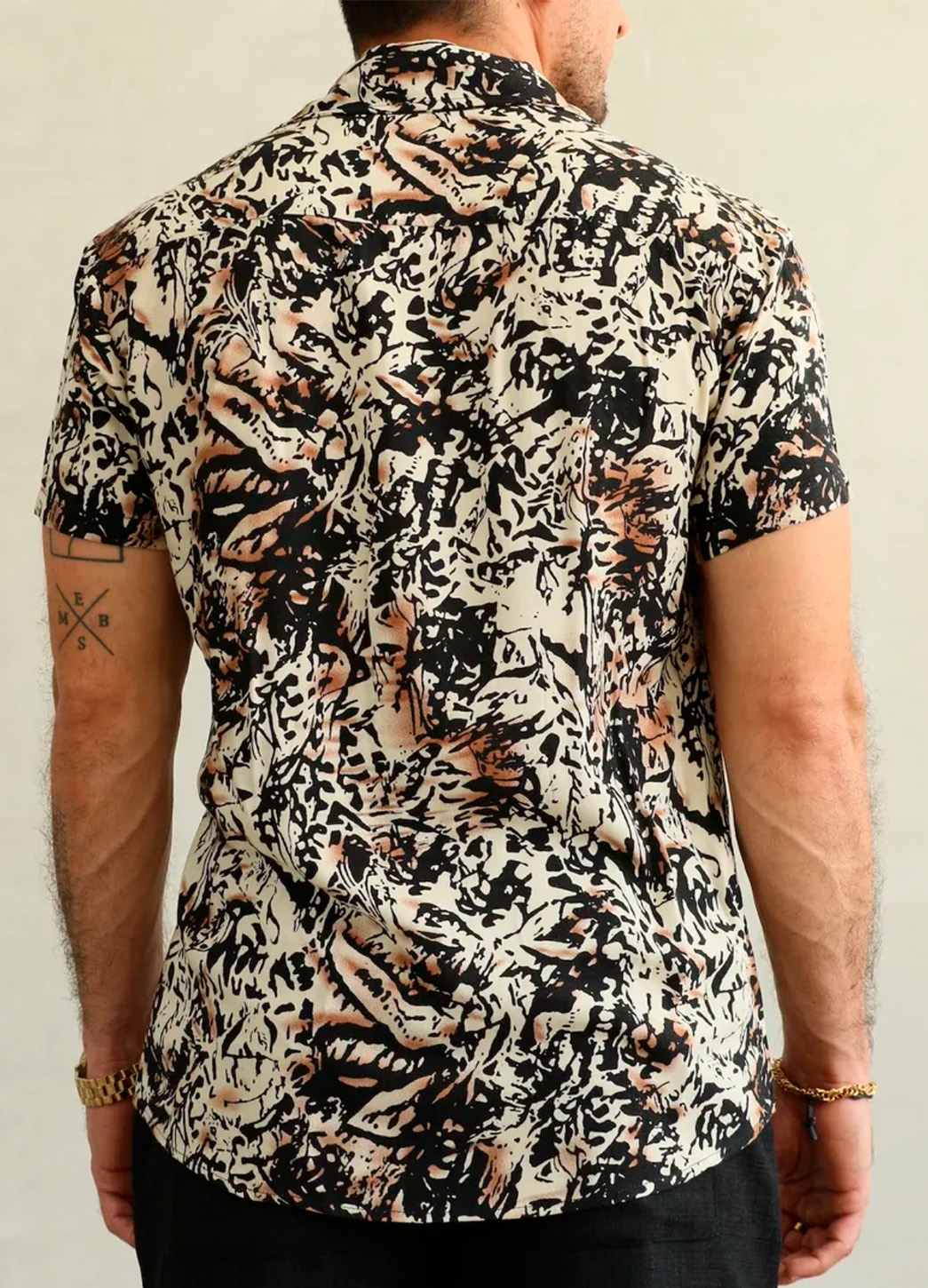 La Camisa Bengala presenta un diseño de manga corta con estampado abstracto en tonos tierra, negro y beige que aporta profundidad visual y un carácter sofisticado. El corte es recto con una caída natural que se adapta al cuerpo sin perder comodidad, ideal para un uso prolongado. El cuello abierto y la botonadura frontal equilibran el diseño, aportando una estética moderna y bien definida.
