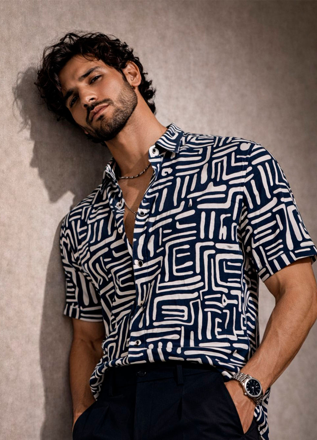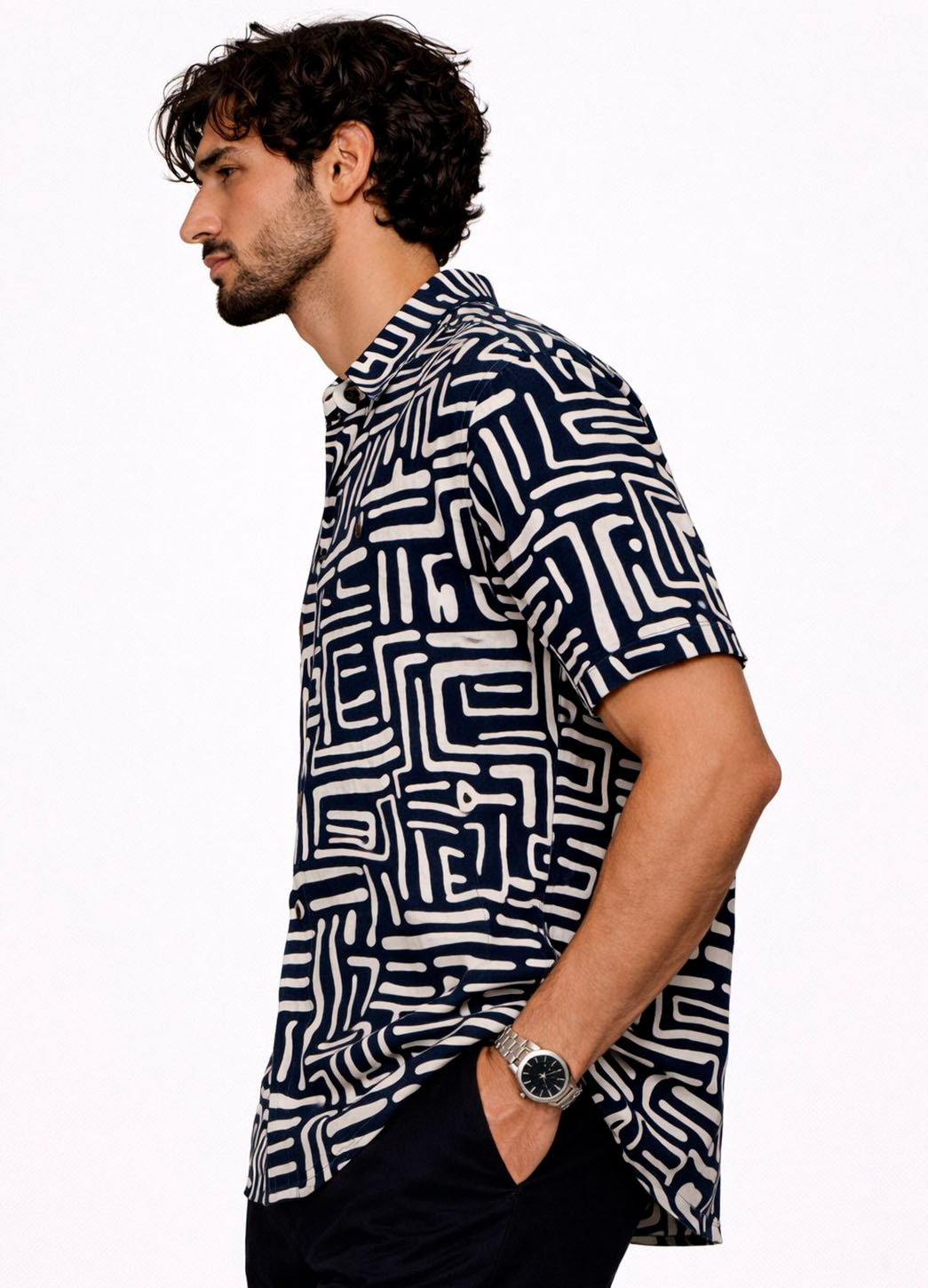 La camisa Bhuk destaca por su patrón orgánico de líneas fluidas que crean un efecto visual dinámico y contemporáneo. Su contraste en tonos oscuros y claros aporta carácter y versatilidad, convirtiéndola en una pieza ideal para looks relajados con un toque sofisticado.