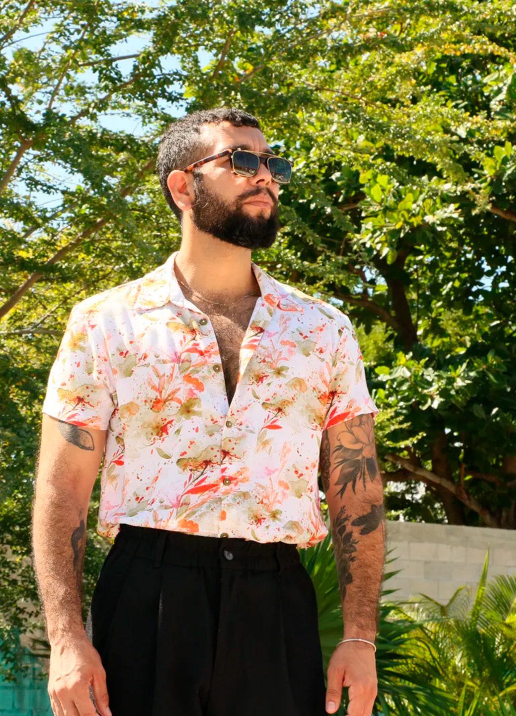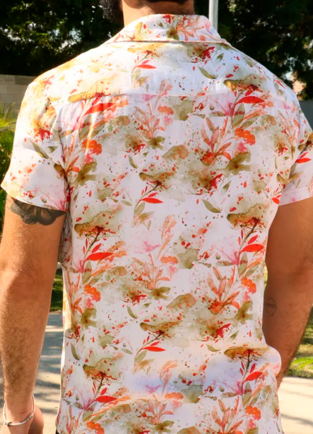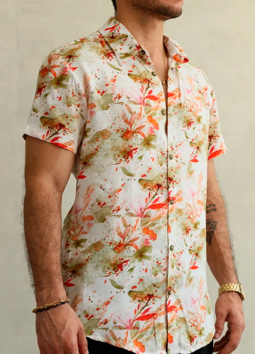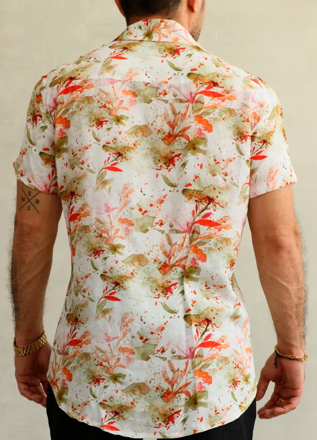 La Camisa Botánica destaca por su diseño de manga corta con un estampado floral de inspiración natural en tonos suaves de verde, coral y beige sobre una base clara. El patrón presenta trazos orgánicos y acuarelados que aportan profundidad visual y un estilo fresco bien equilibrado.