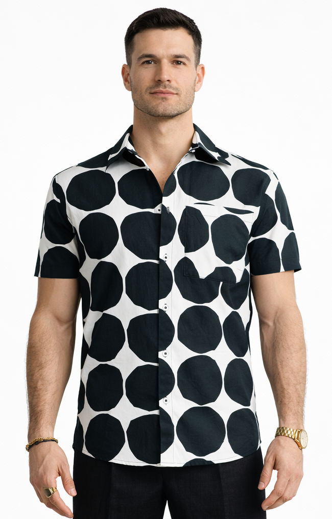 La Camisa Clásica Kusa presenta un diseño de manga corta con un estampado geométrico de círculos irregulares en contraste blanco y negro que aporta un carácter gráfico fuerte y contemporáneo. Su patrón repetitivo genera impacto visual manteniendo un equilibrio limpio y bien definido.