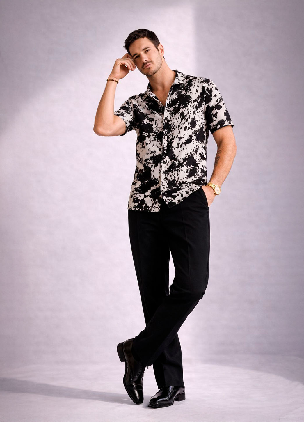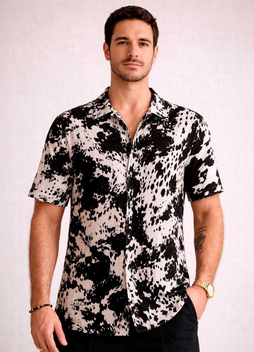 Camisa para hombre con diseño clásico reinterpretado en un estampado abstracto en blanco y negro que aporta un estilo moderno y llamativo. Confeccionada en tela ligera y transpirable, ofrece frescura y comodidad durante todo el día, ideal para climas cálidos o salidas nocturnas.