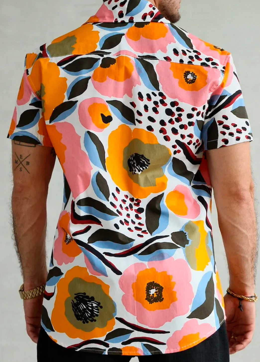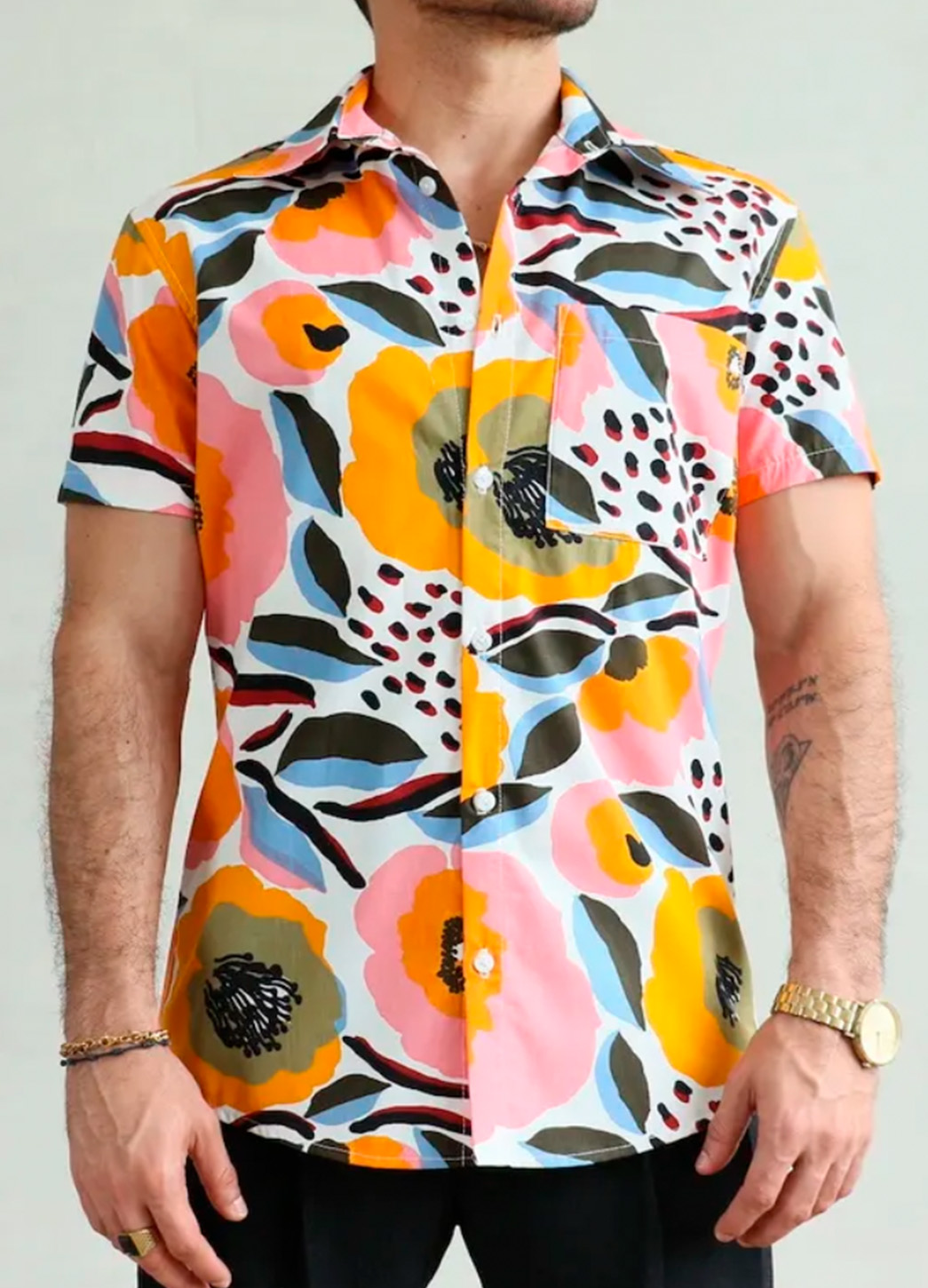 La Camisa Clásica Olmos presenta un diseño de manga corta con un estampado floral abstracto en una paleta equilibrada de tonos rosa, amarillo, azul y verde sobre base clara. La composición combina formas orgánicas y detalles gráficos que aportan dinamismo visual sin perder armonía.