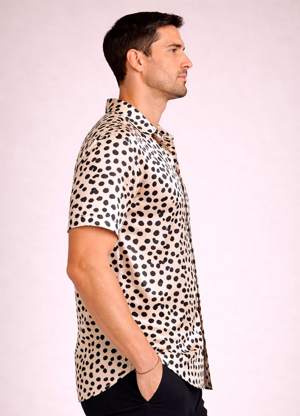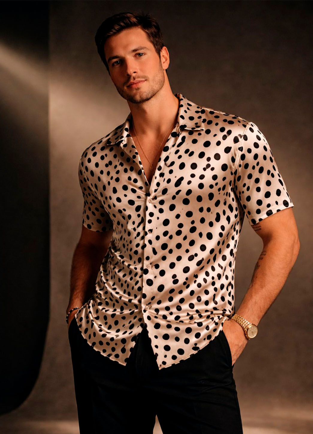 Camisa para hombre con acabado satinado y diseño de lunares en contraste que aporta un estilo moderno, elegante y llamativo. Confeccionada en tela ligera, suave y transpirable, ofrece una caída fluida que realza la silueta con naturalidad y confort.