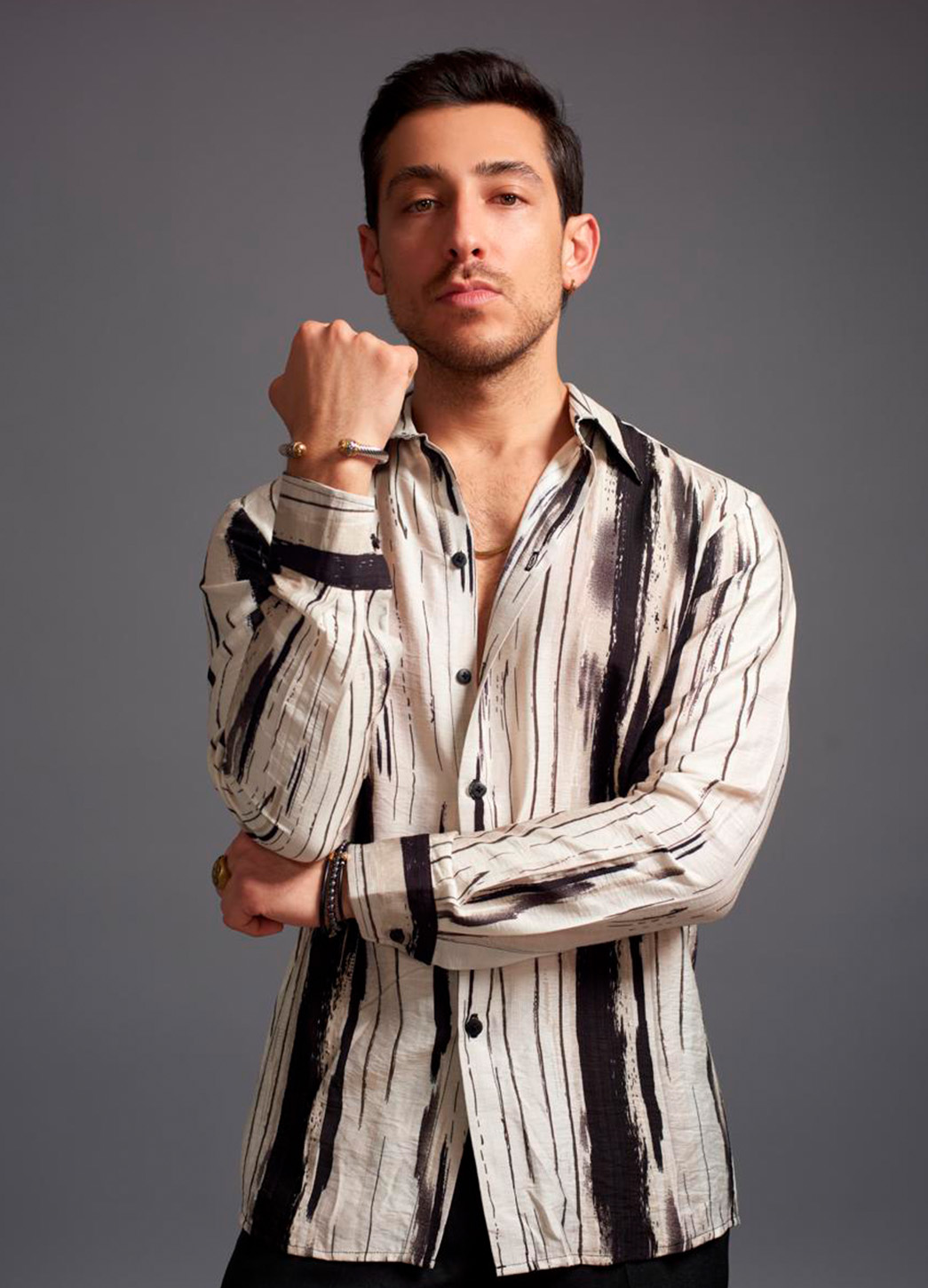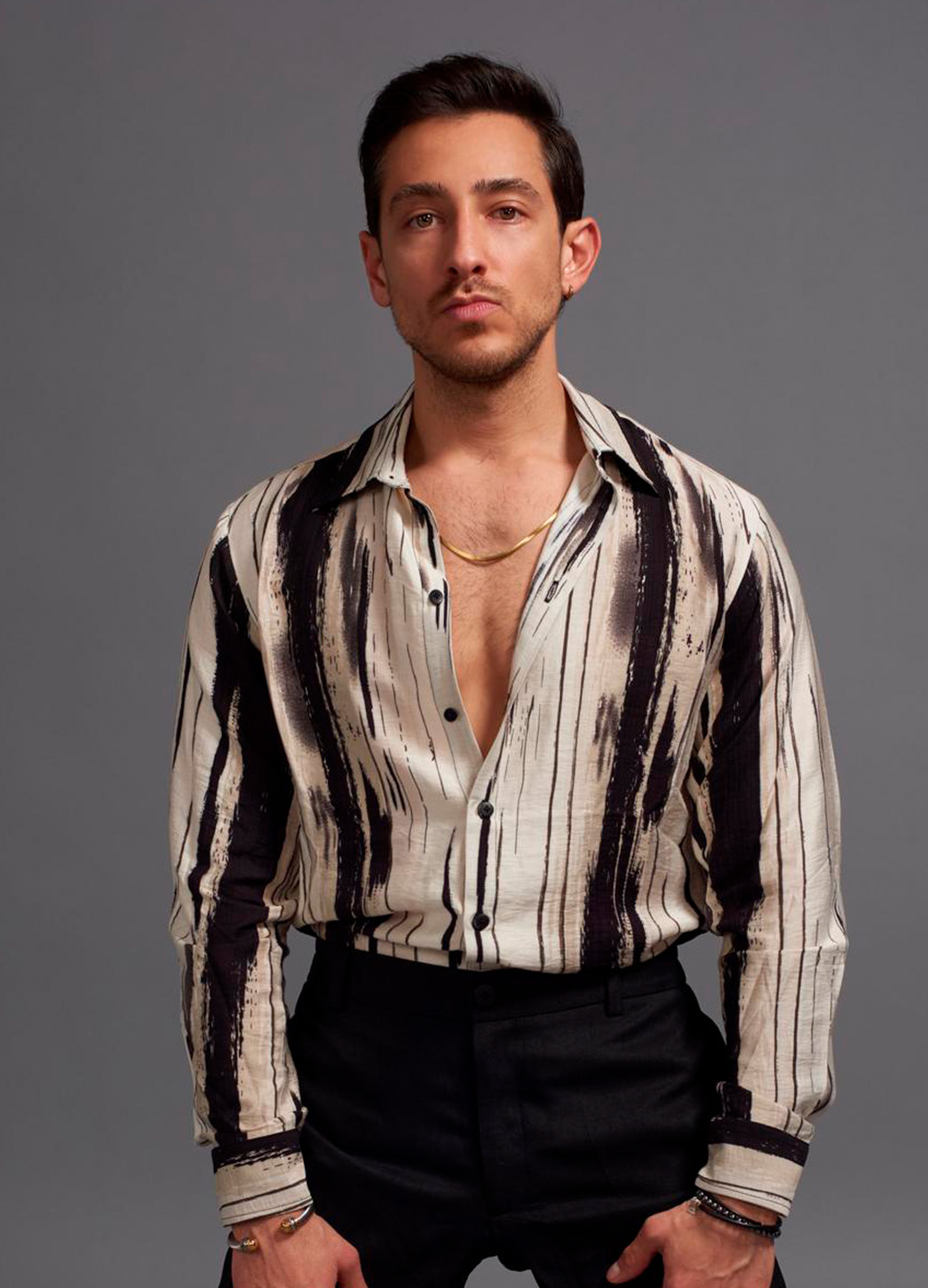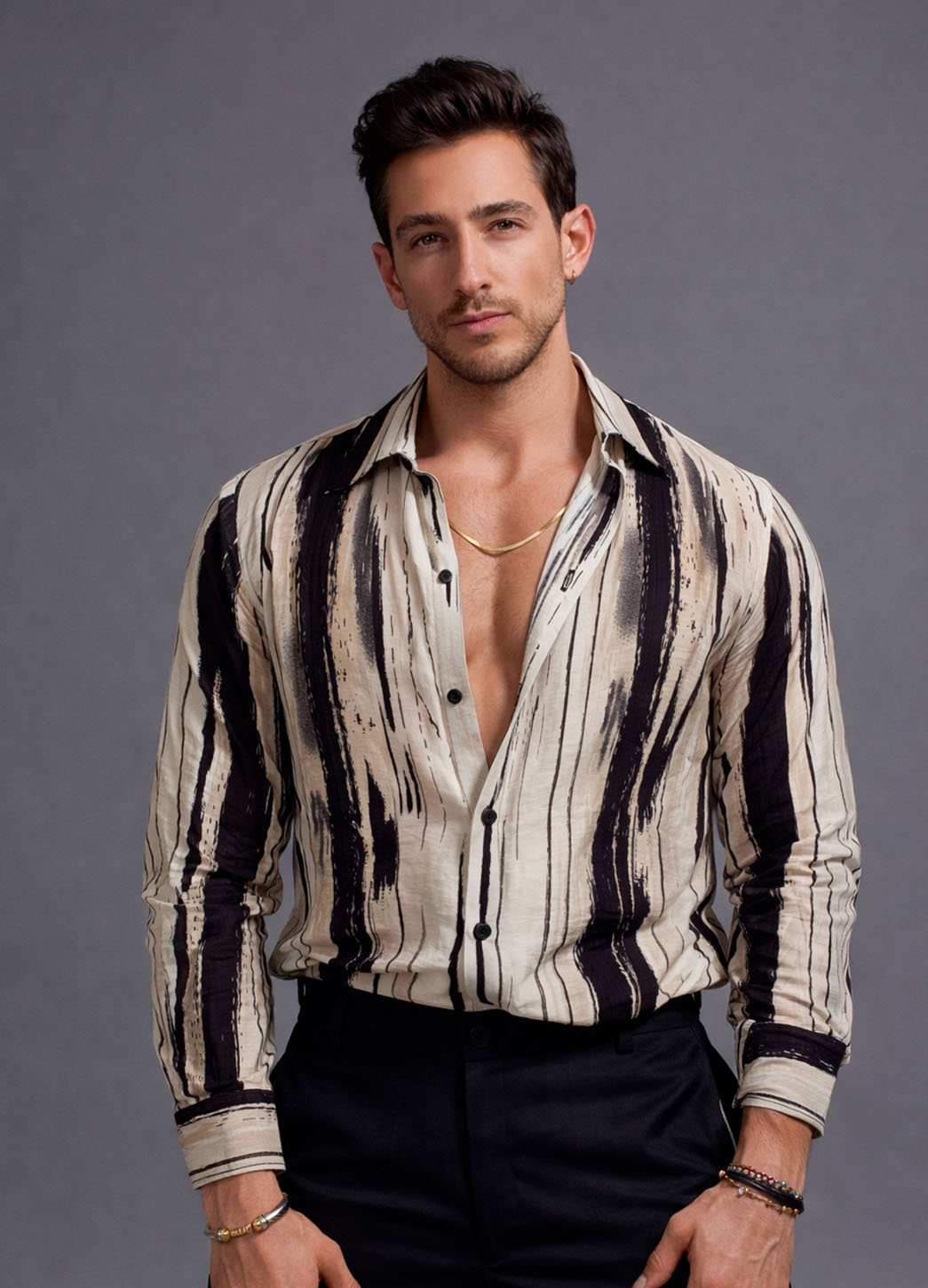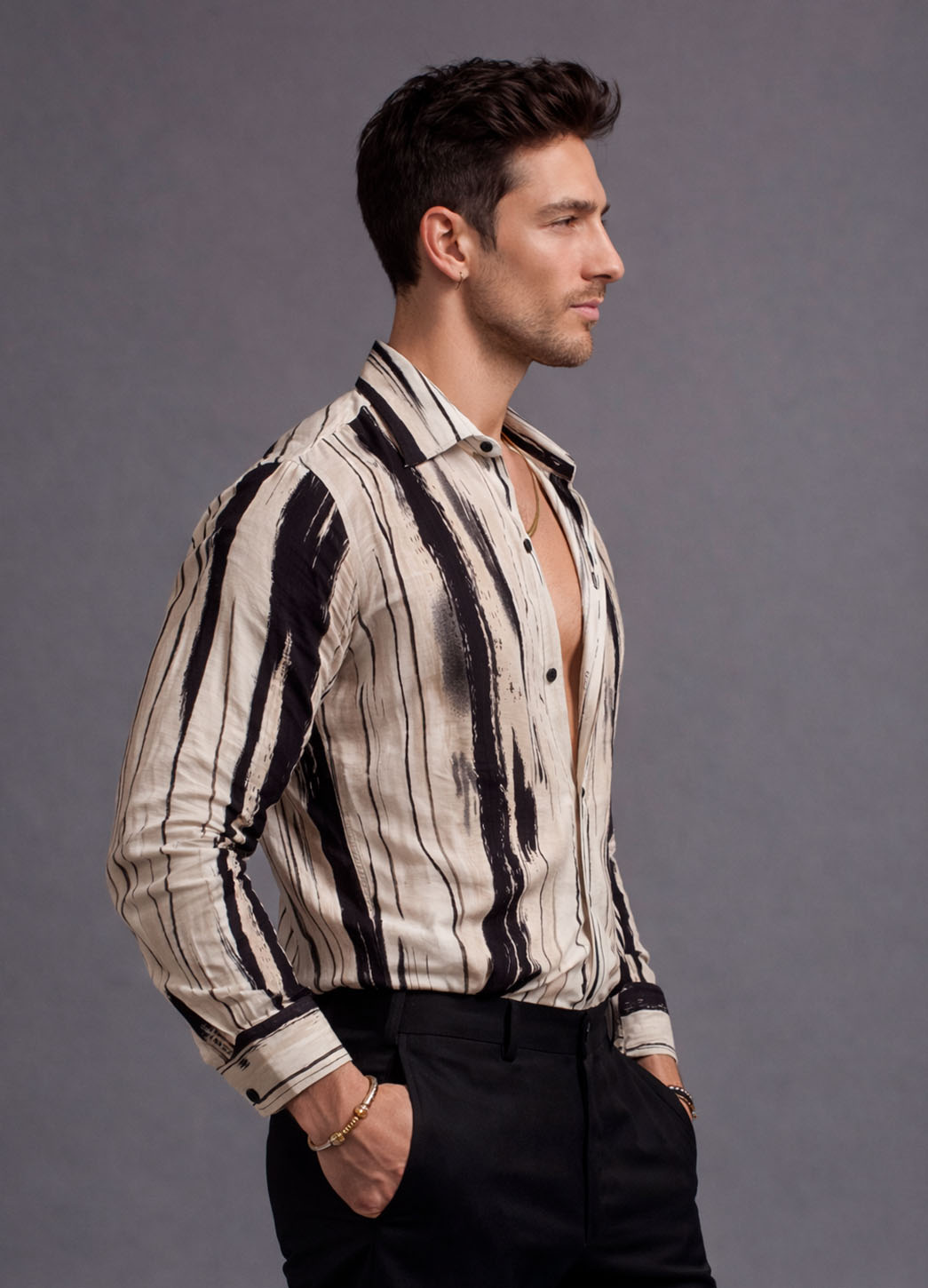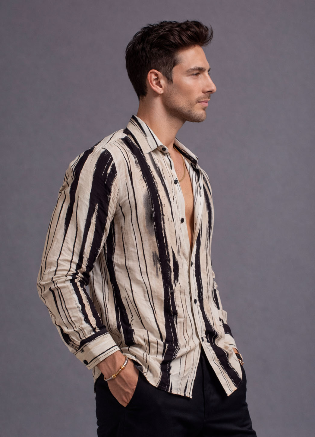 La Camisa Cortez de manga larga destaca por su estilo elegante y artístico gracias a su estampado en tonos blanco hueso y negro, inspirado en trazos alargados que evocan pinceladas modernas. Su diseño vertical estiliza la figura mientras aporta un aire sofisticado y contemporáneo.