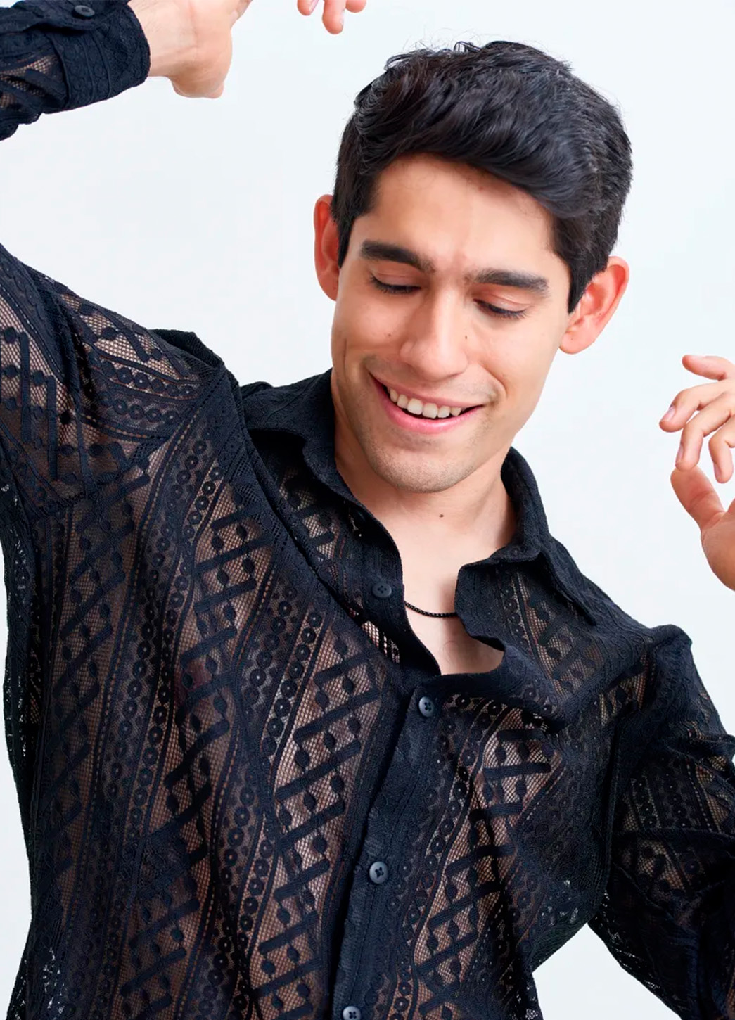 Las mangas mantienen el mismo juego de transparencias, reforzando un estilo audaz y refinado. La tela luce ligera y flexible, ideal para eventos nocturnos o looks de alto impacto. Es una prenda pensada para quienes buscan distinción, carácter y una presencia moderna con personalidad marcada.