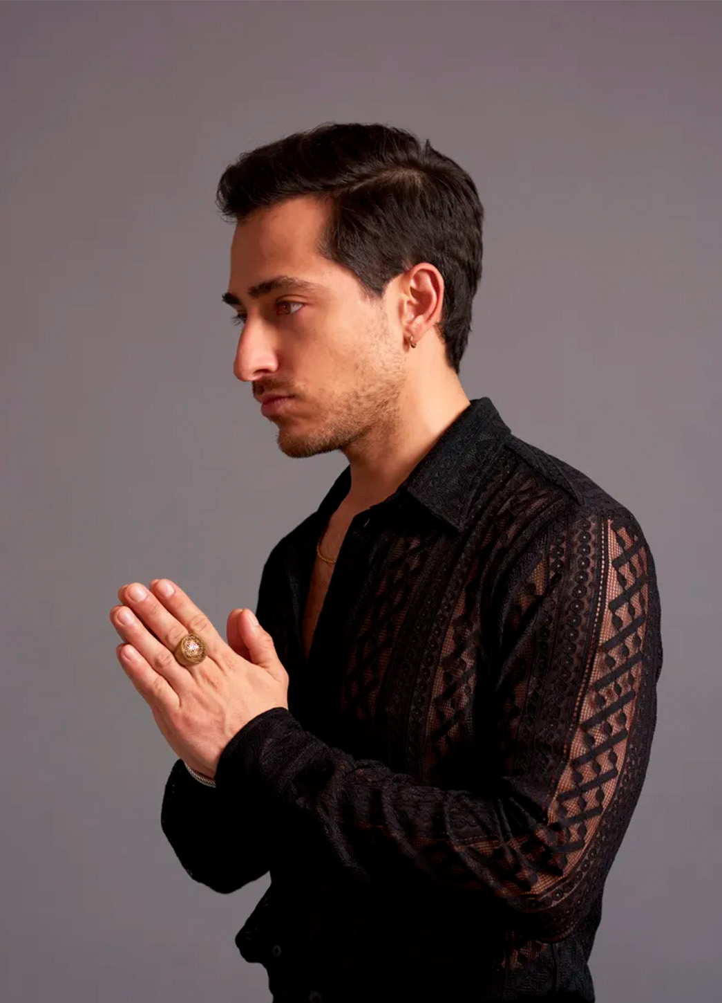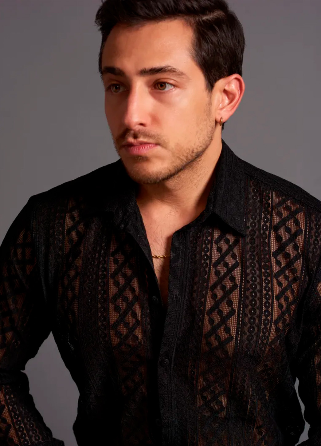 Esta camisa de manga larga presenta un diseño sofisticado con tejido translúcido en color negro que combina patrones geométricos y detalles florales, creando una textura visual rica y elegante. El corte es entallado, definiendo la silueta sin perder fluidez, mientras que el cuello clásico y la botonadura frontal aportan estructura y equilibrio.