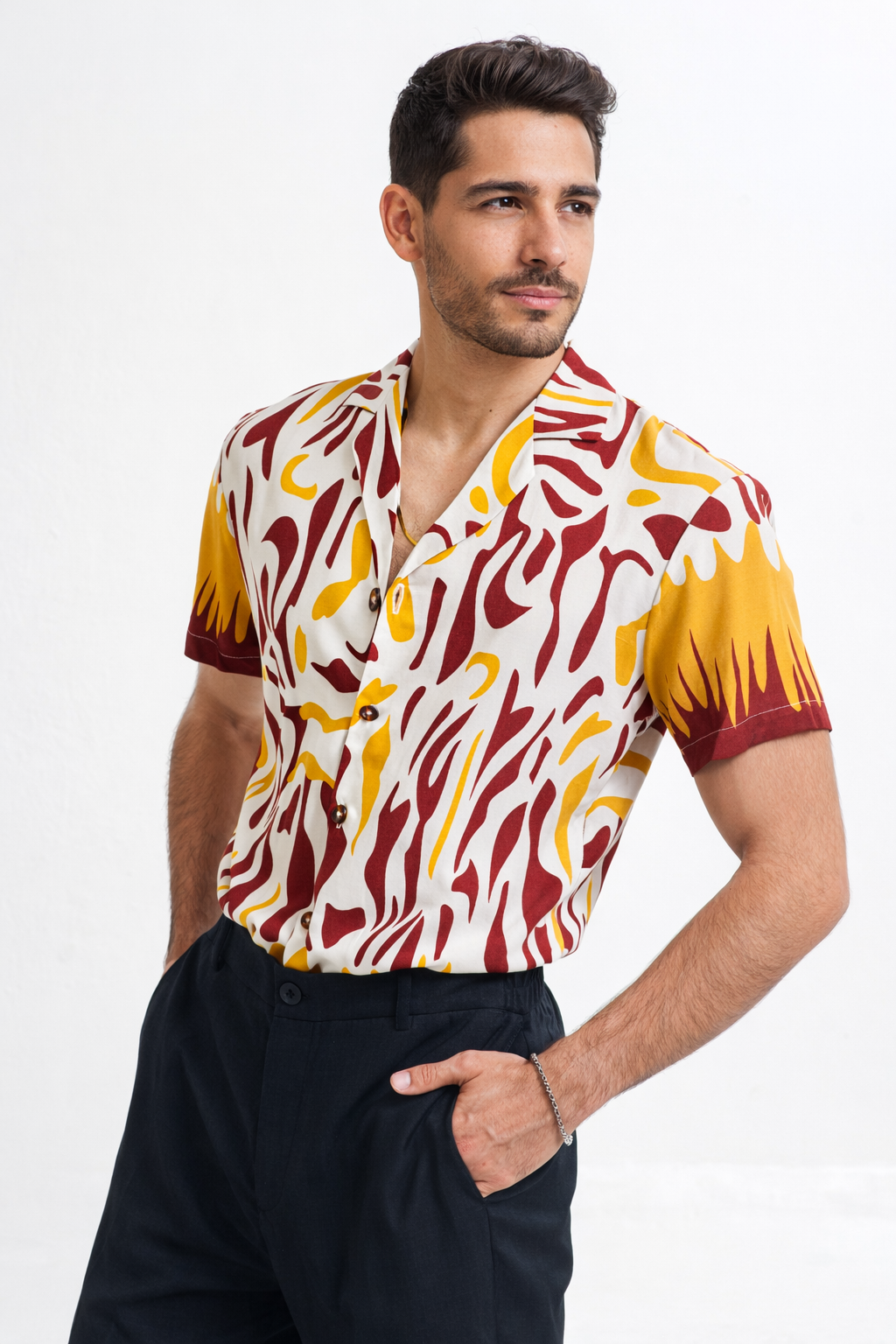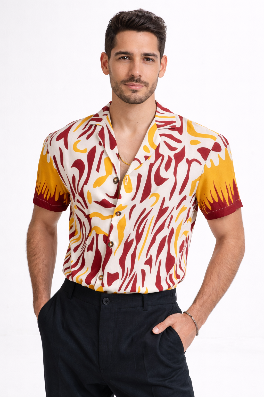 La Camisa Hakuna destaca por su explosión de color y un diseño vibrante que captura atención al instante. Su estampado combina tonos amarillo mostaza, terracota y marfil en un patrón dinámico inspirado en formas orgánicas y fuego estilizado, creando una pieza llena de energía y movimiento. La manga corta ofrece frescura y comodidad, mientras que la tela ligera aporta una caída suave ideal para climas cálidos o looks relajados. Al combinarla con pantalón oscuro, como en la imagen, el contraste potencia aún más su presencia, convirtiéndola en la prenda perfecta para quienes buscan estilo, originalidad y un toque audaz en su outfit. Una camisa diseñada para destacar con personalidad auténtica y moderna.