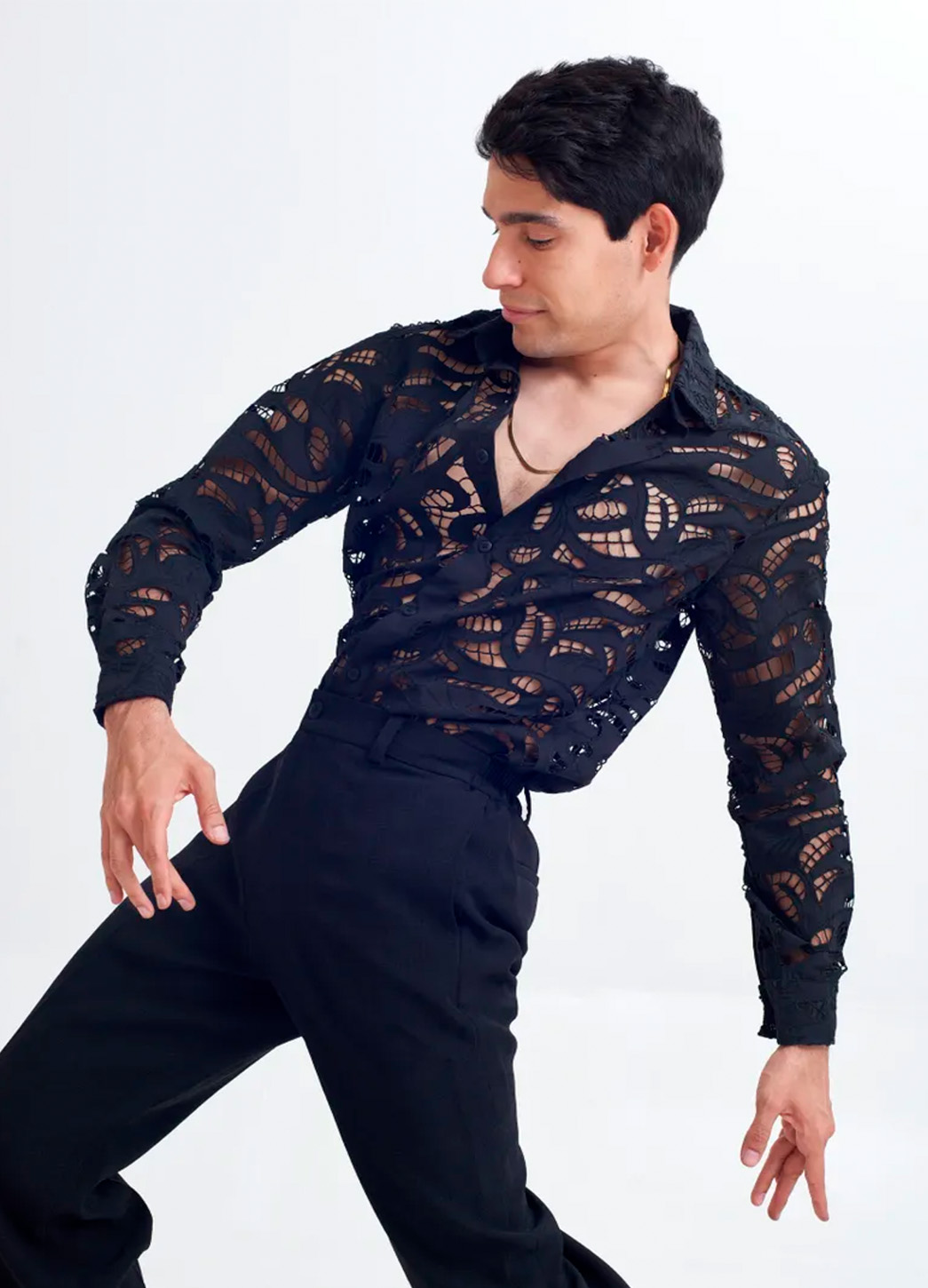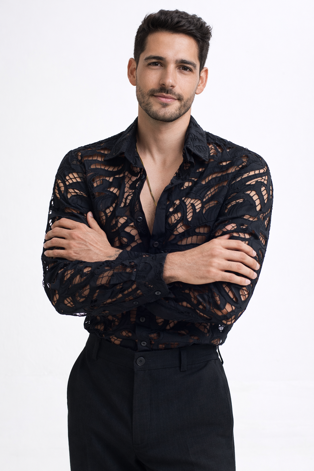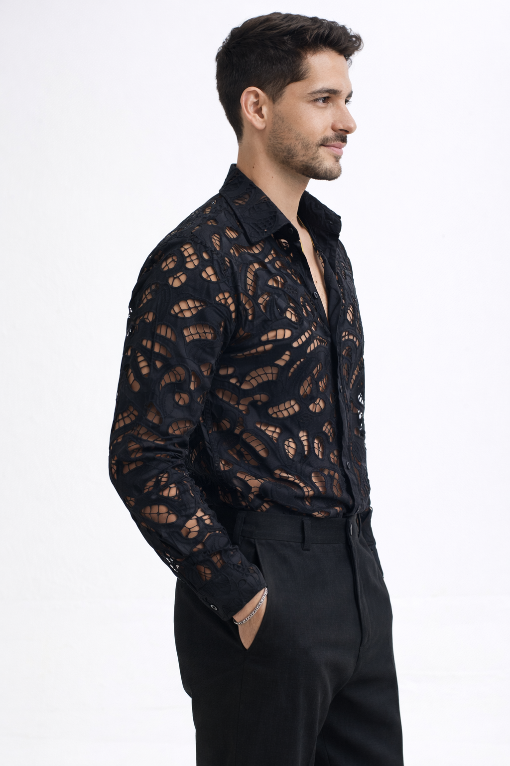 Esta camisa de manga larga destaca por su tejido calado en color negro que crea un juego visual elegante y provocador, dejando ver la piel de forma sutil y sofisticada. El diseño presenta cuello clásico con botones frontales que equilibran la transparencia con una estructura definida.