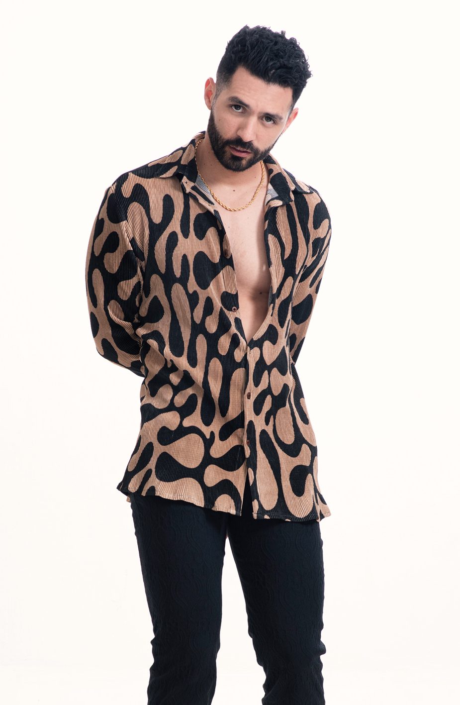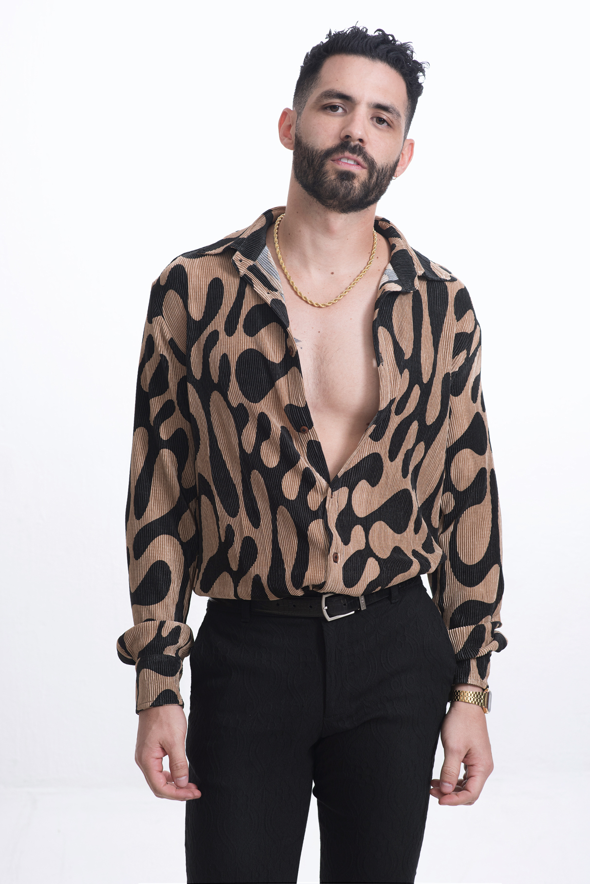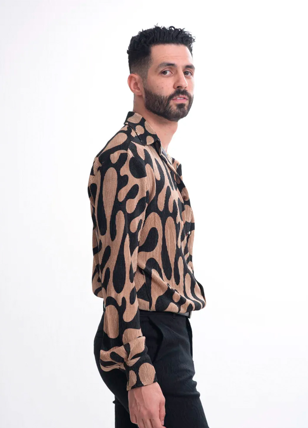 La Camisa Rocko destaca por su diseño audaz y contemporáneo, combinando un patrón animal print abstracto en tonos camel y negro que transforma cualquier look en una declaración de estilo. Su textura acanalada aporta relieve y elegancia, mientras el corte relajado y el escote profundo transmiten una vibra moderna y segura.