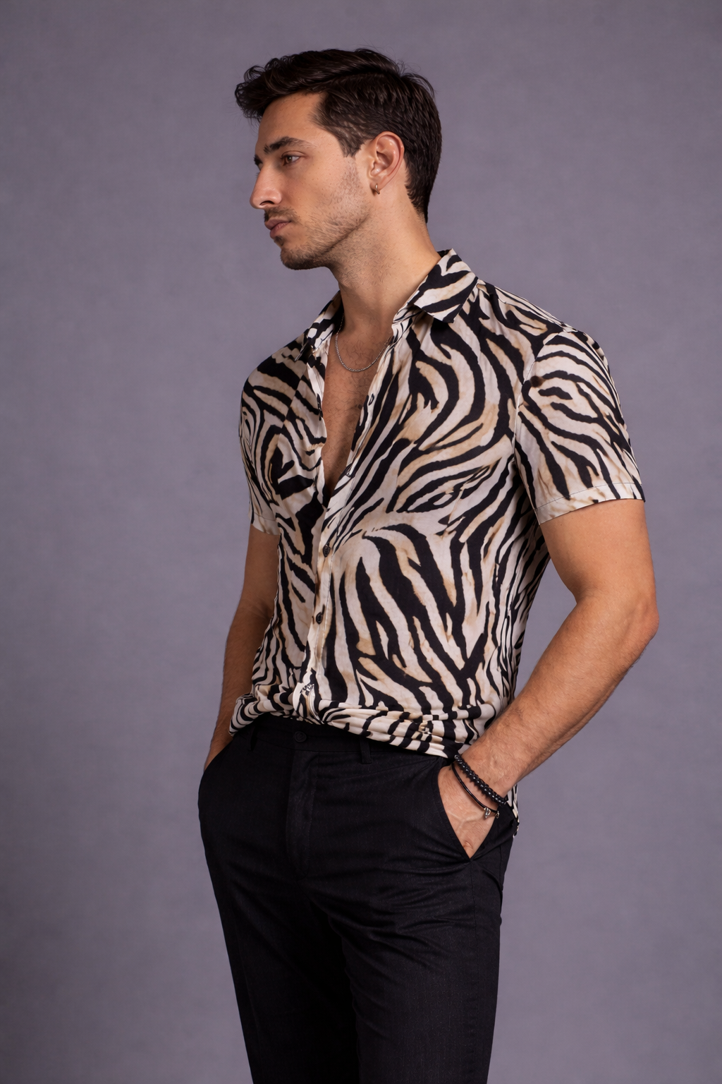La Camisa Selvia destaca por su estilo salvaje y contemporáneo gracias a su estampado tipo animal print inspirado en patrones de cebra. Sobre un fondo beige cálido, las líneas negras crean un contraste poderoso que aporta fuerza, actitud y una estética moderna imposible de ignorar.