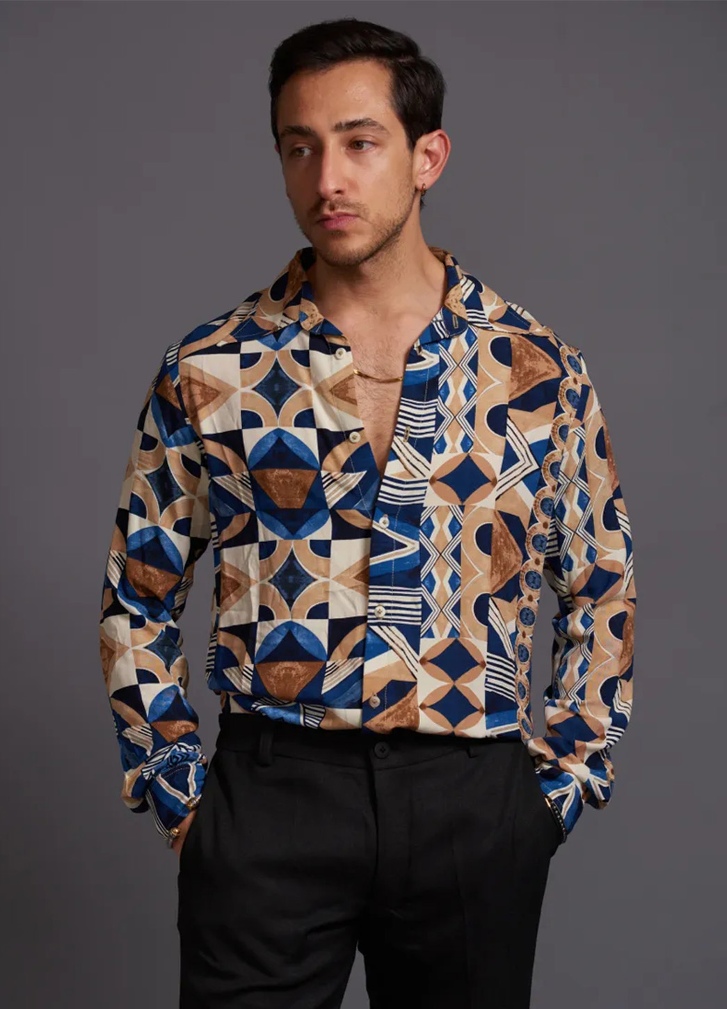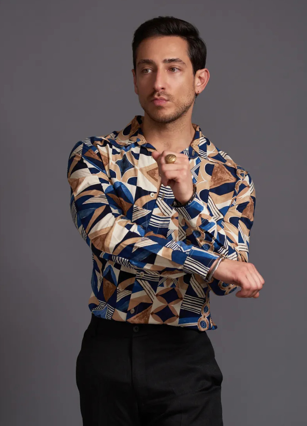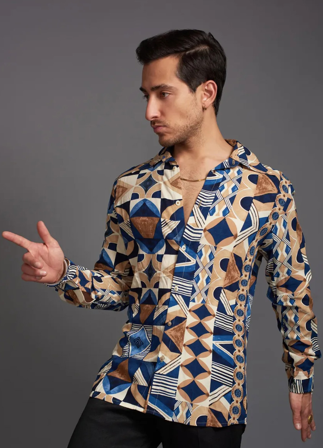 La Camisa Seyak de manga larga destaca por su diseño geométrico sofisticado y lleno de personalidad. Su estampado mezcla tonos azul marino, beige, crema y café en figuras abstractas que crean un patrón visual dinámico y moderno.