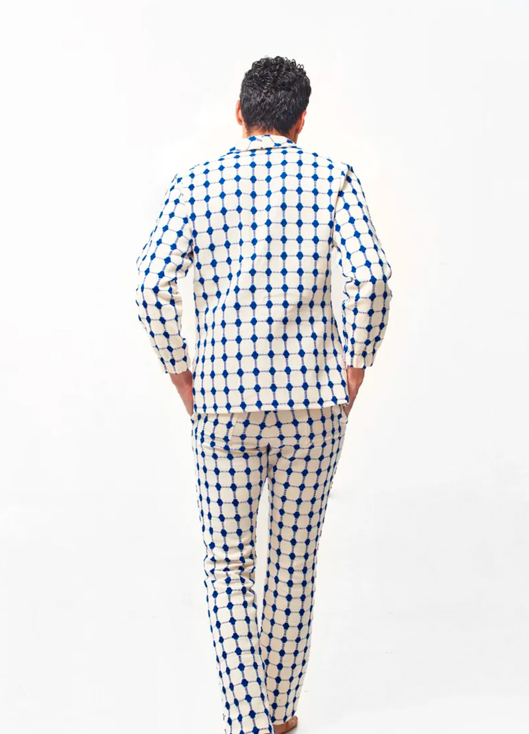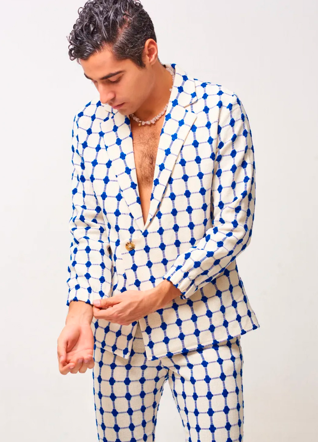 El Conjunto Bak´ech destaca por su diseño geométrico en tonos marfil y azul vibrante, creando un look moderno, artístico y totalmente protagónico. Su blazer de corte relajado, sin camisa debajo, proyecta seguridad y estilo vanguardista, mientras que el tejido grueso y texturizado aporta una estética premium ideal para editoriales, eventos y moda de alto impacto.