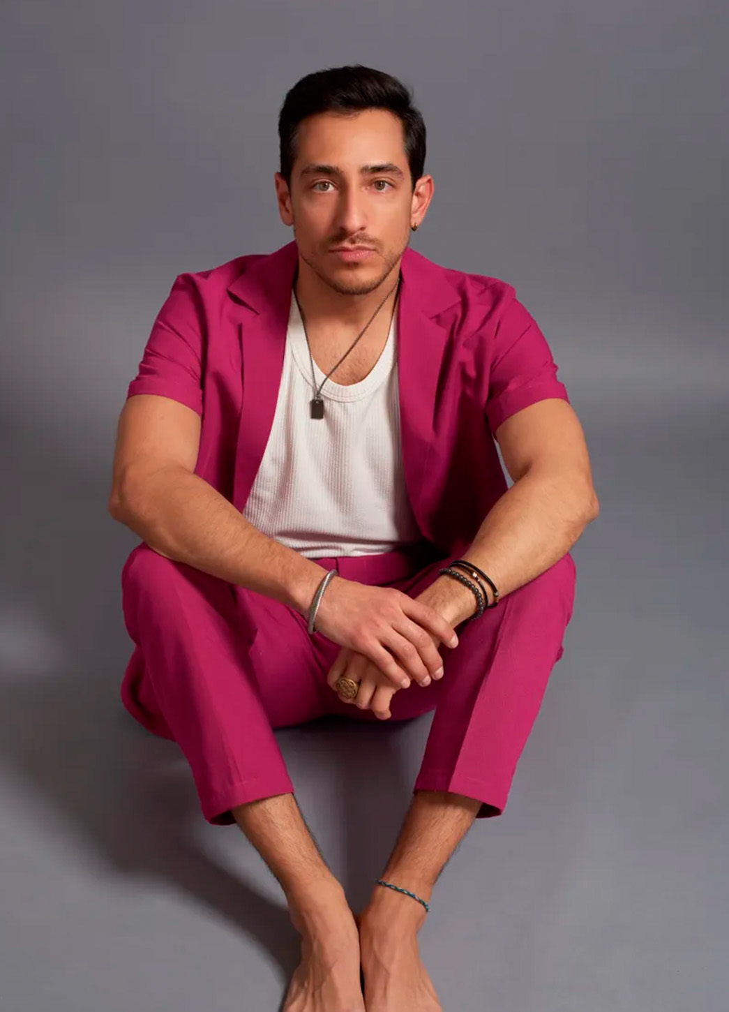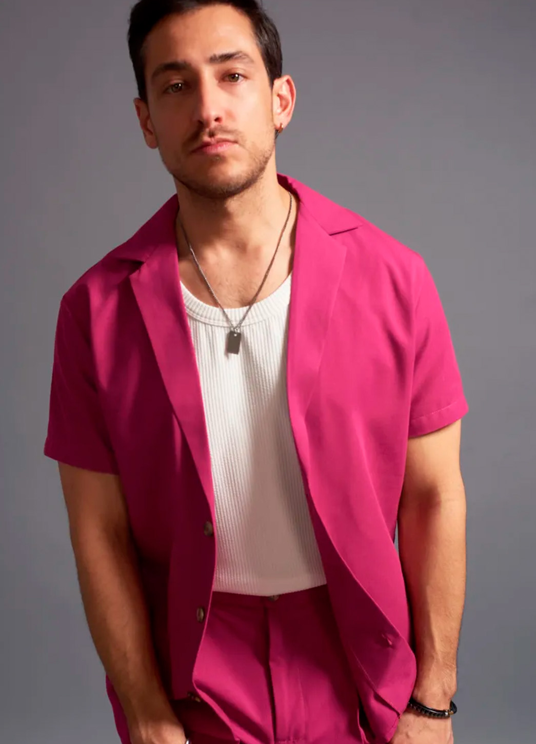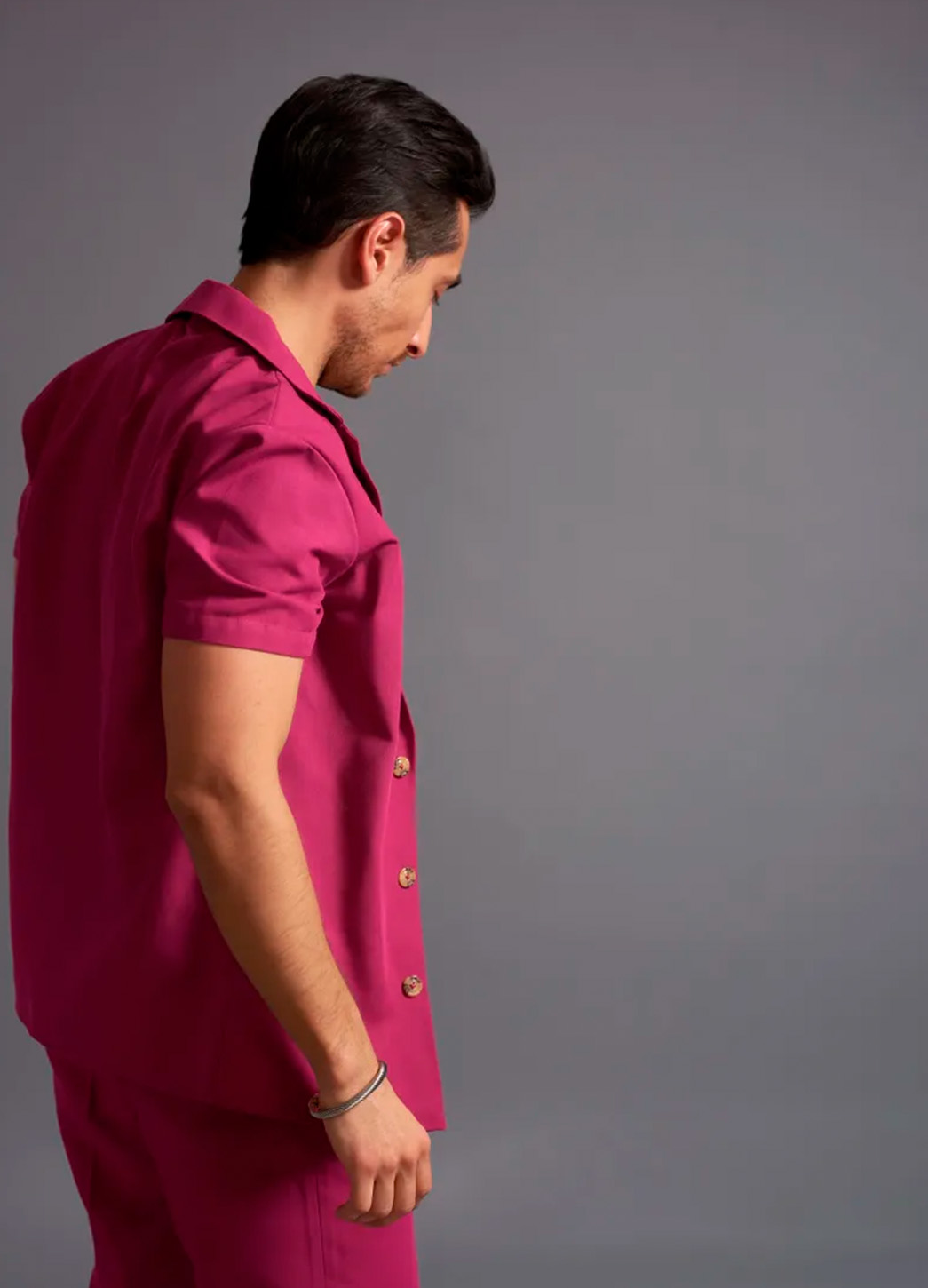 El Conjunto Fhiero (camisa y pantalón) destaca por su explosión de color y estilo contemporáneo. El vibrante tono magenta domina por completo el look, ofreciendo una presencia poderosa, moderna y totalmente protagonista. La camisa de manga corta, con caída relajada y botones metálicos que aportan brillo sutil, transmite frescura y actitud.