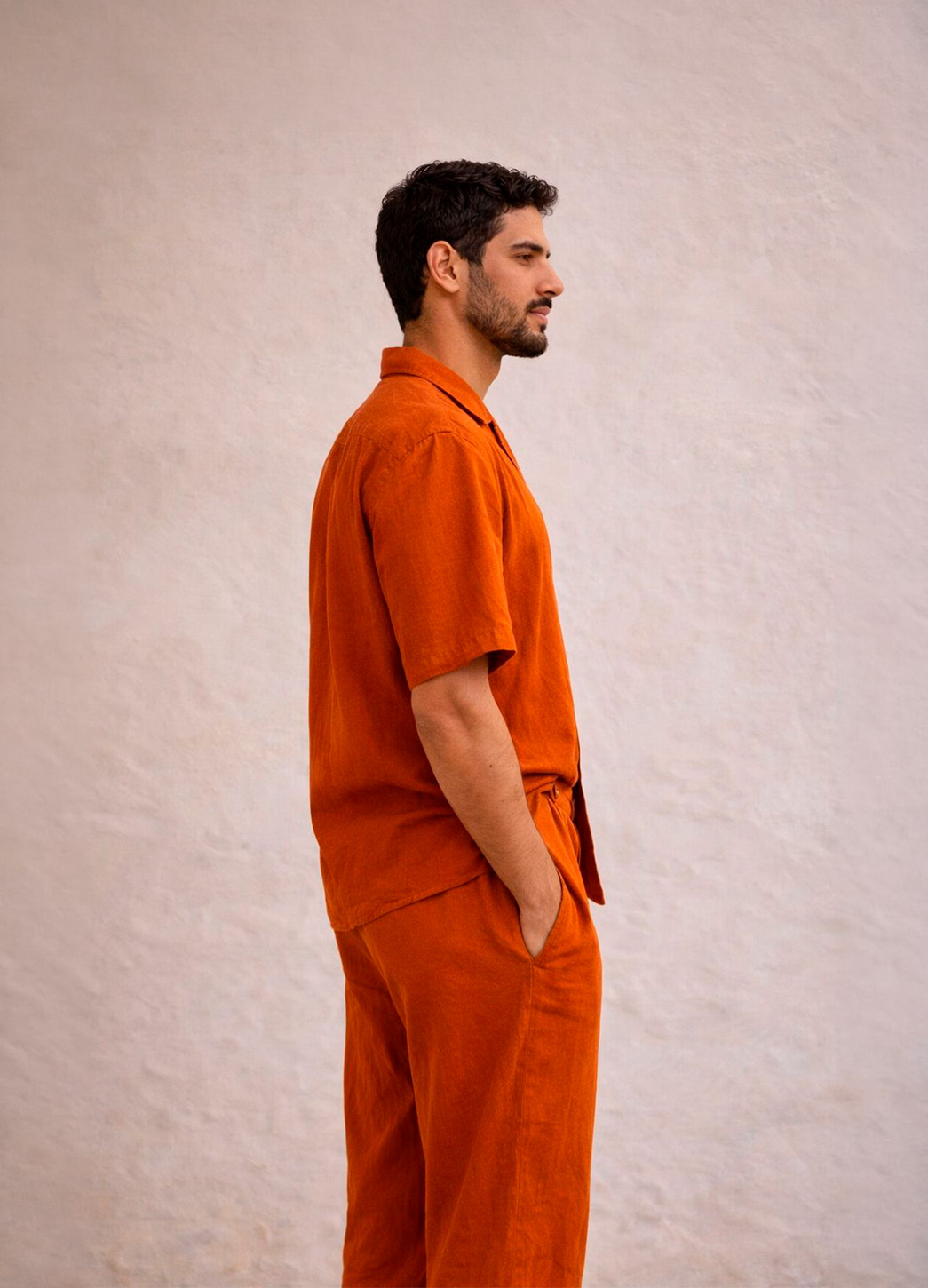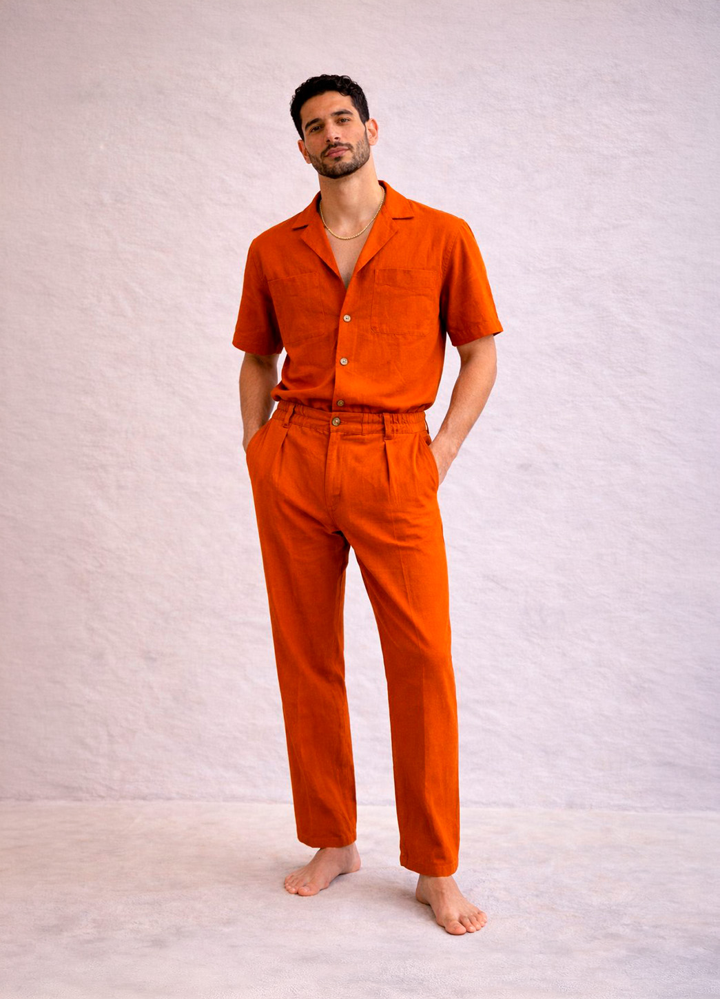 El conjunto Liik destaca por su diseño relajado y contemporáneo en un vibrante tono naranja que transmite energía y estilo. Compuesto por camisa de manga corta con cuello abierto y pantalón de corte cómodo, ofrece un equilibrio perfecto entre frescura y sofisticación.
