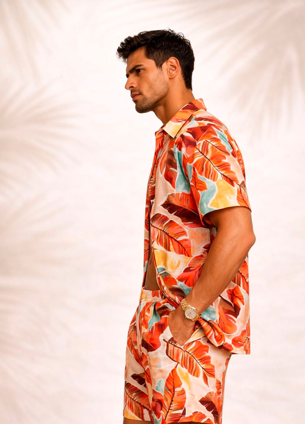 Camisa para hombre con diseño tropical en tonos vibrantes que combinan naranja, rojo y acentos frescos, creando un estilo llamativo y lleno de energía. Confeccionada en tela ligera y transpirable, ofrece máxima comodidad y frescura, ideal para climas cálidos, vacaciones o looks de verano.