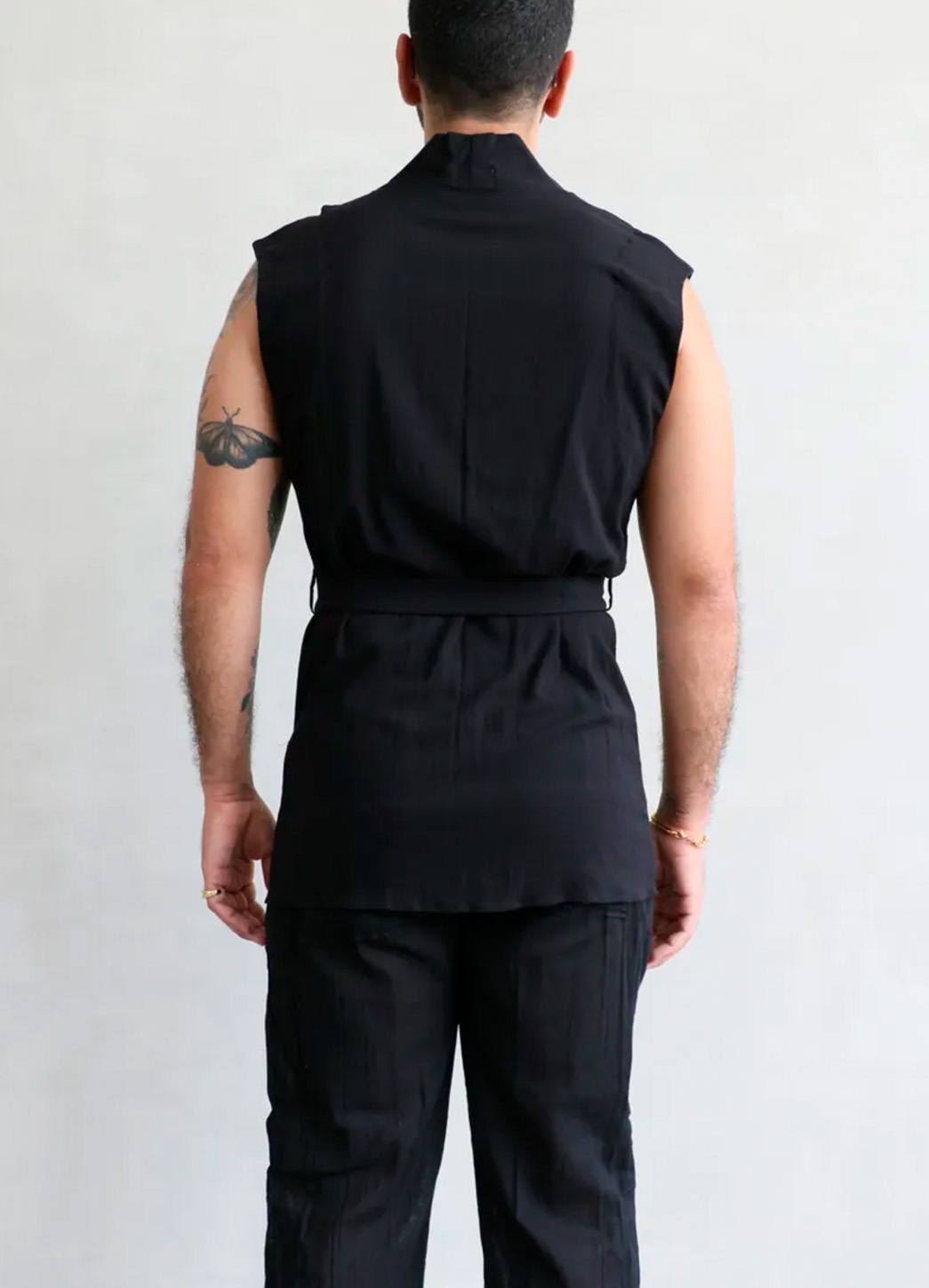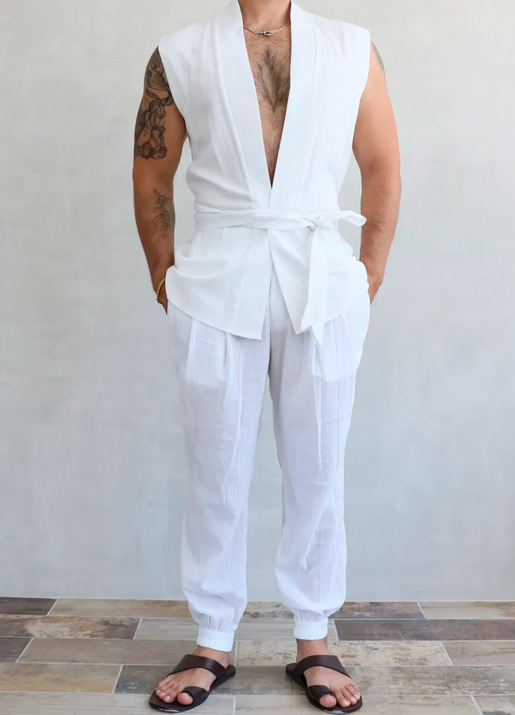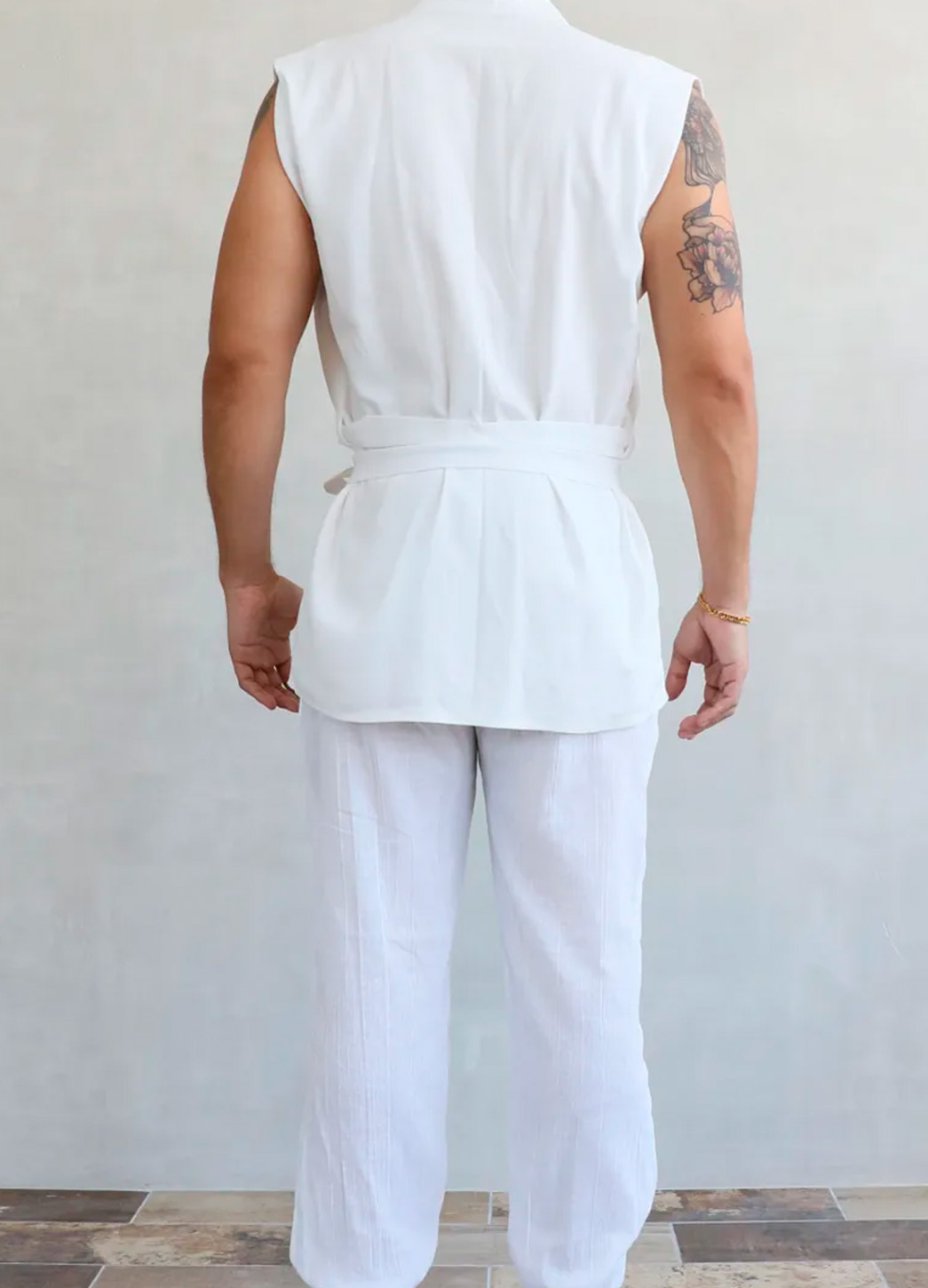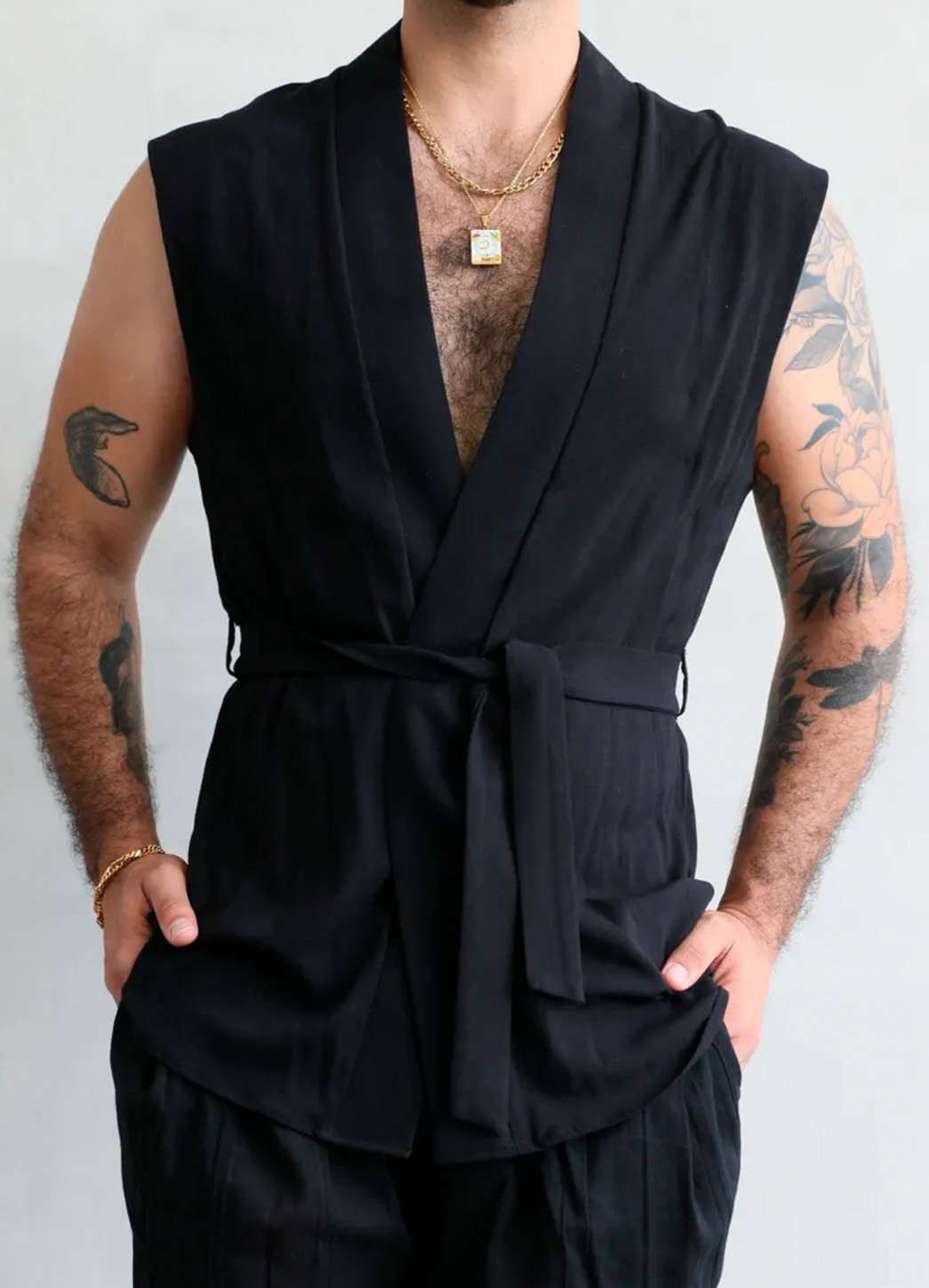 El Conjunto Maak se distingue por su diseño contemporáneo y fluido, pensado para quienes buscan una estética sofisticada con total libertad de movimiento. La parte superior presenta un corte sin mangas con escote cruzado profundo y ajuste mediante cinturón del mismo tejido, que permite definir la silueta de forma natural y elegante. El pantalón a juego, de corte recto con terminación ajustada en los tobillos, aporta equilibrio visual y comodidad durante todo el día.