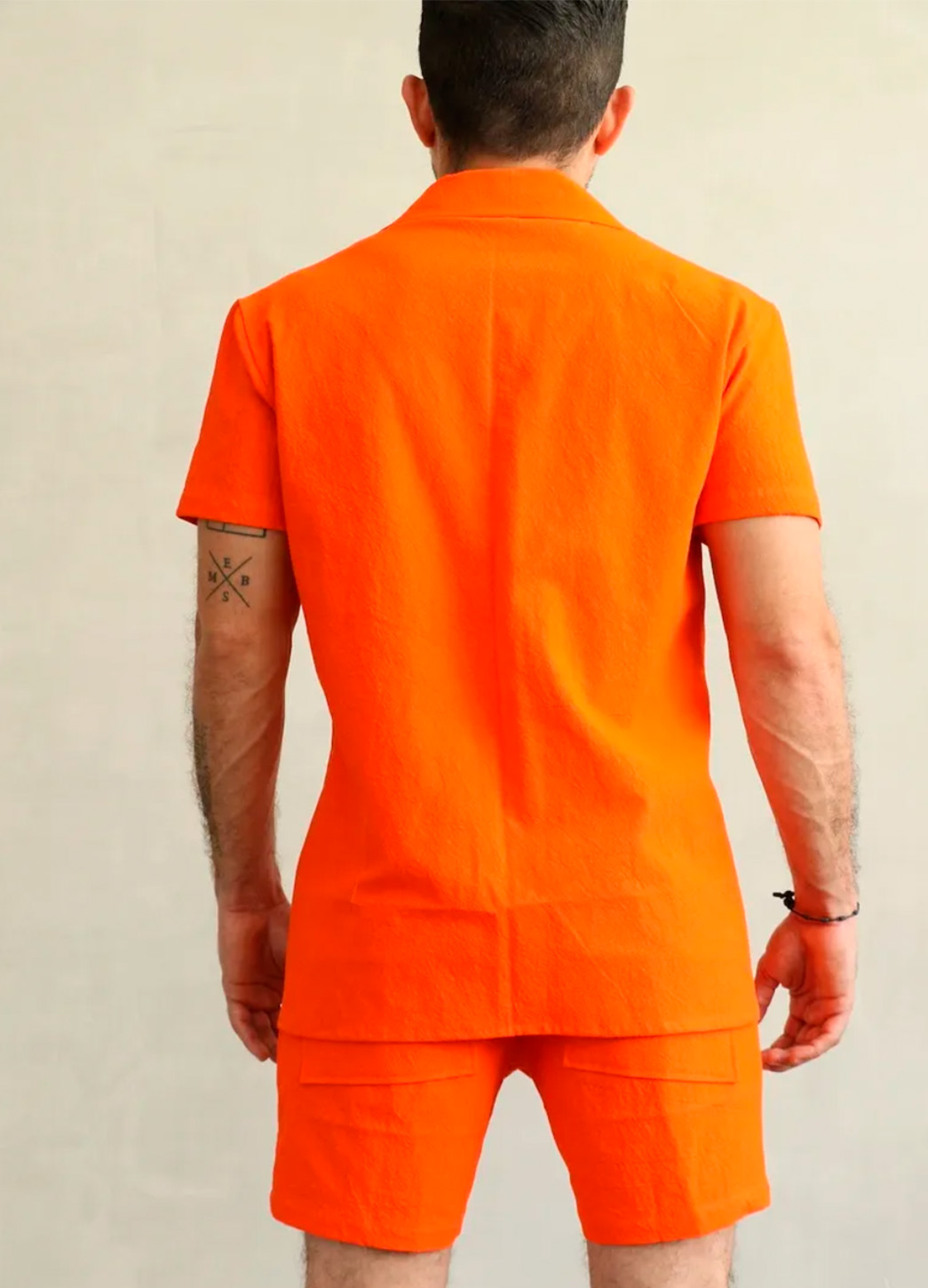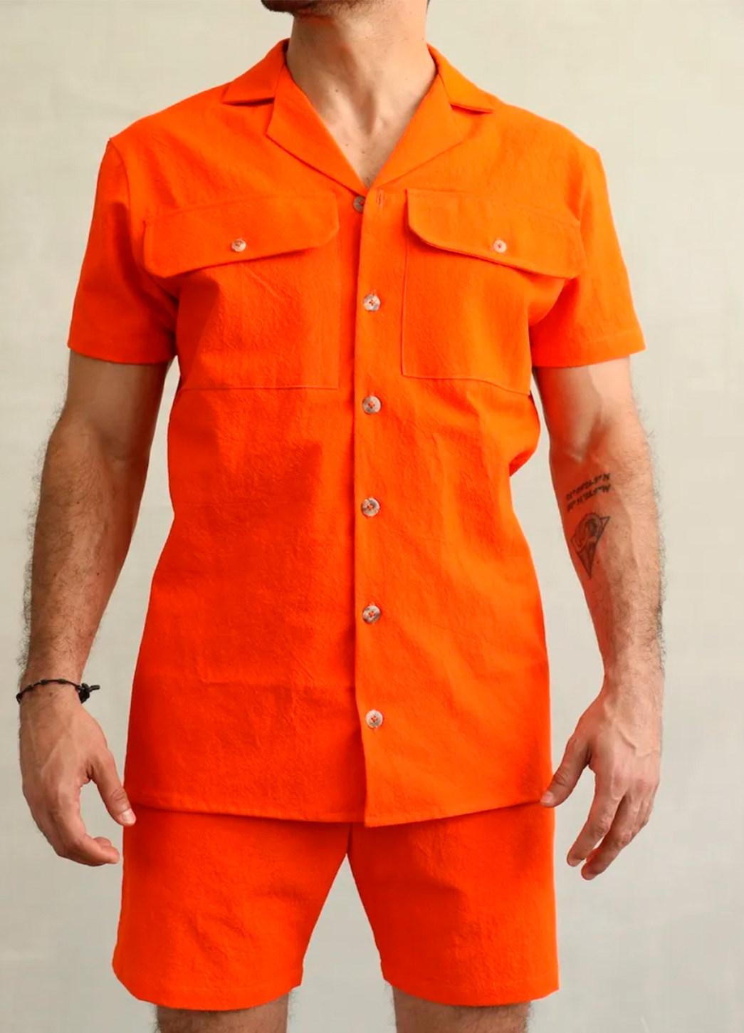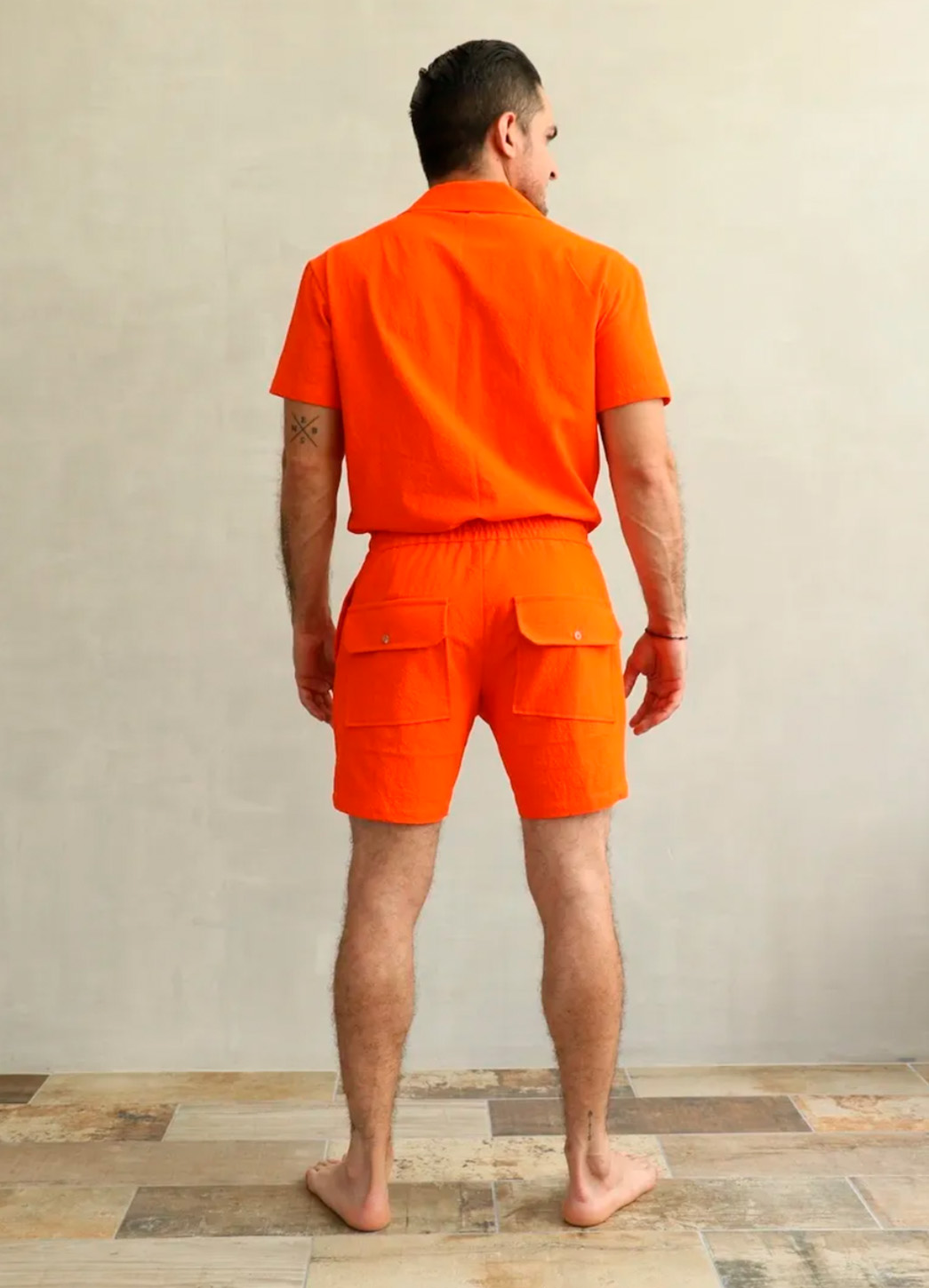 El Conjunto Magma destaca por su diseño de manga corta y silueta coordinada que integra una camisa estructurada con short a juego en un tono naranja intenso y vibrante. La camisa cuenta con cuello tipo resort, botonadura frontal y bolsillos superiores con tapa que aportan carácter visual y funcionalidad. El short complementa el conjunto con pretina elástica, ajuste cómodo y bolsillos traseros que refuerzan su practicidad.