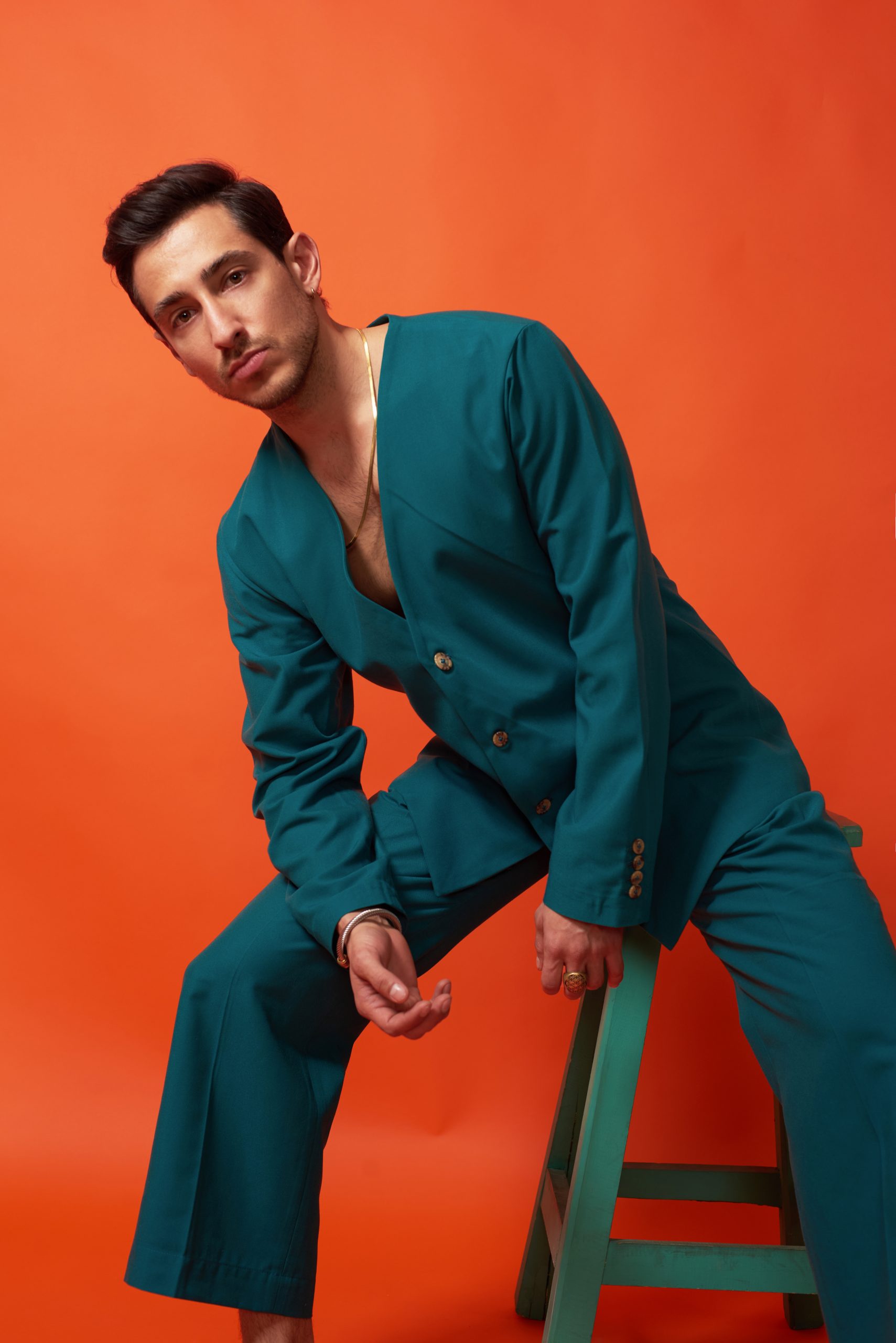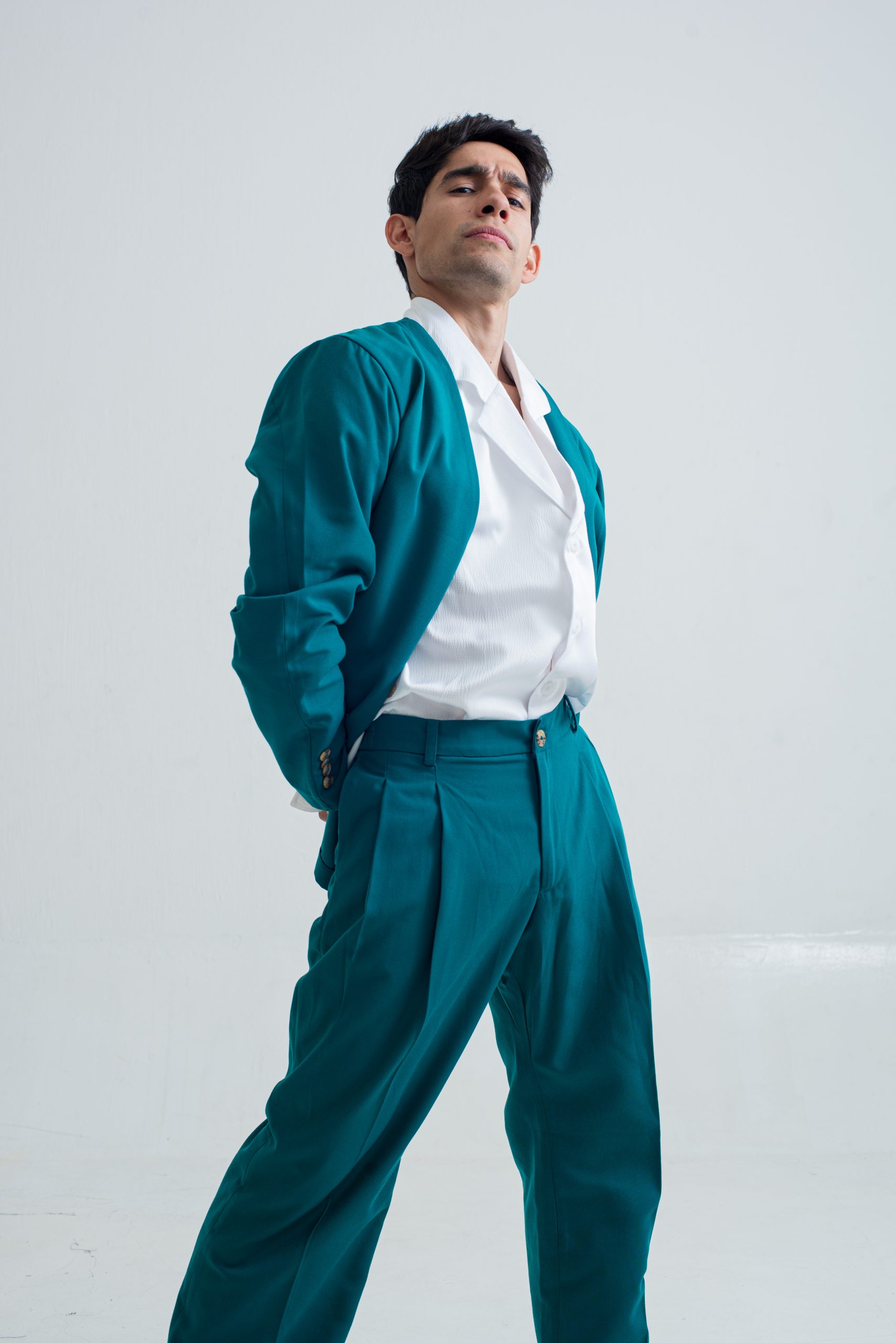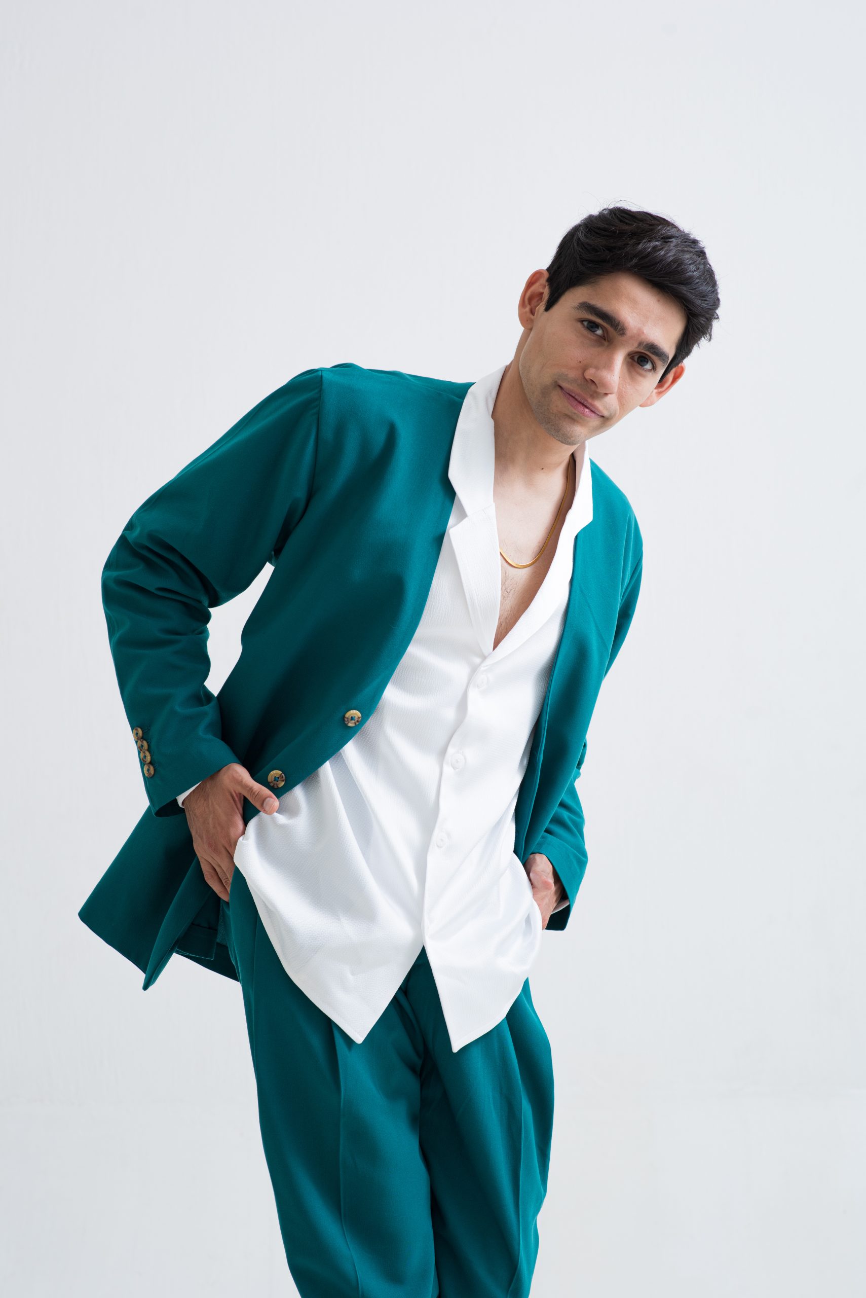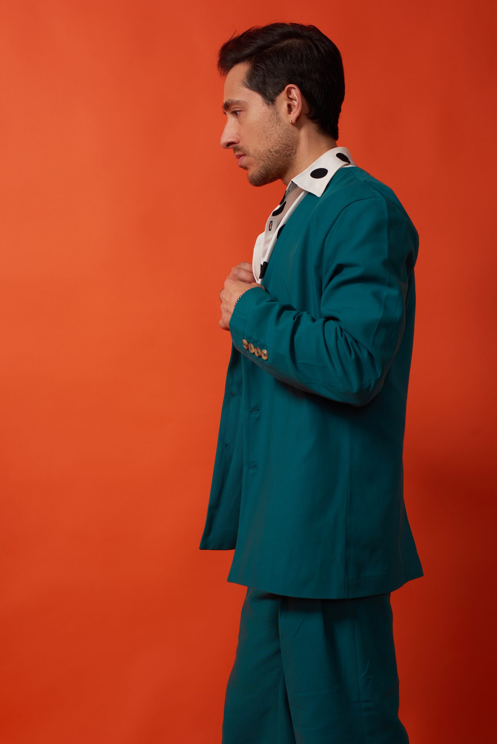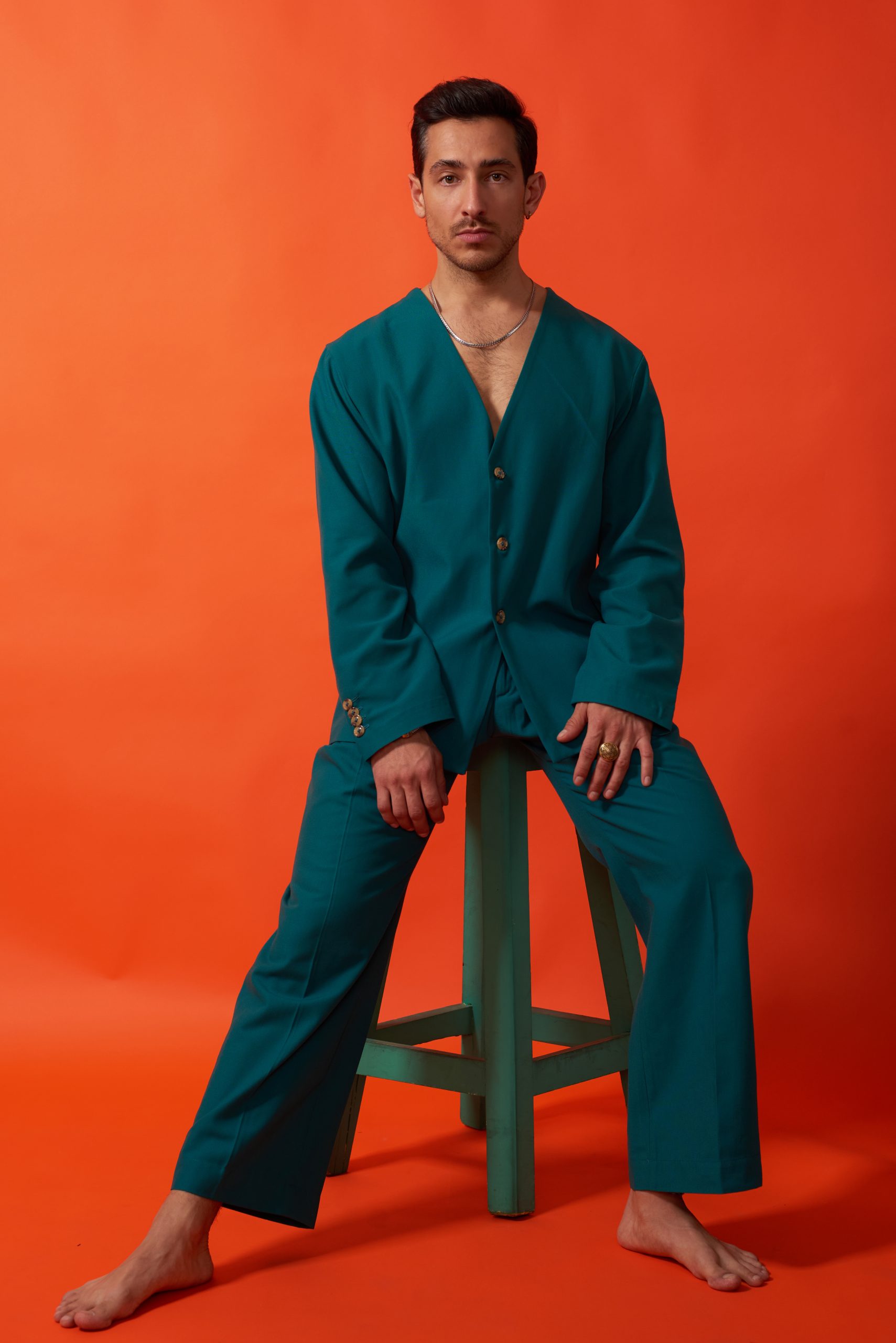 El Conjunto Pizzarro (saco y pantalón) destaca por su estética moderna y relajada, combinando elegancia y movimiento. El saco en tono verde petróleo presenta un diseño estructurado pero fluido, con botones metálicos que añaden un toque sofisticado. El pantalón, amplio y cómodo, acompaña la silueta con caída natural, ideal para transmitir estilo sin esfuerzo. La camisa blanca debajo crea un contraste limpio y fresco, elevando la apariencia total.