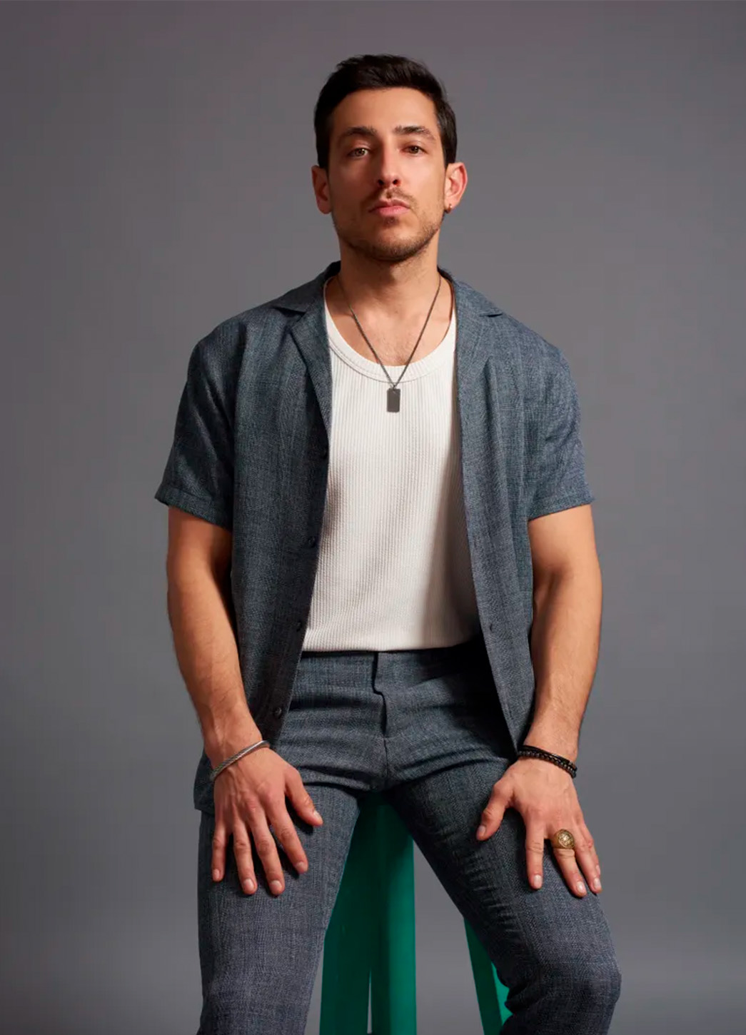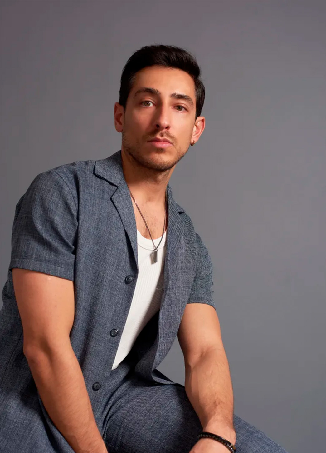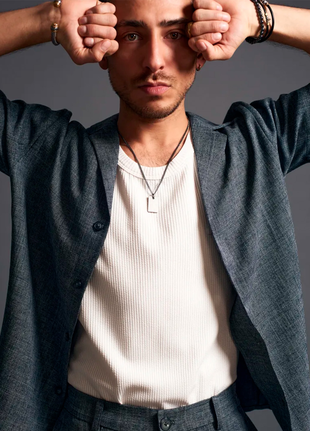 La camisa de manga corta tiene un fit limpio y estructurado, ideal para lucir sofisticado sin esfuerzo, mientras que el pantalón a juego ofrece un corte semi–entallado que estiliza la figura sin sacrificar comodidad. El look se complementa con una camiseta blanca interior y accesorios metálicos, logrando una vibra fresca, urbana y con mucha personalidad. Perfecto para ocasiones casuales elevadas, sesiones creativas y momentos en los que el estilo auténtico habla por sí solo.