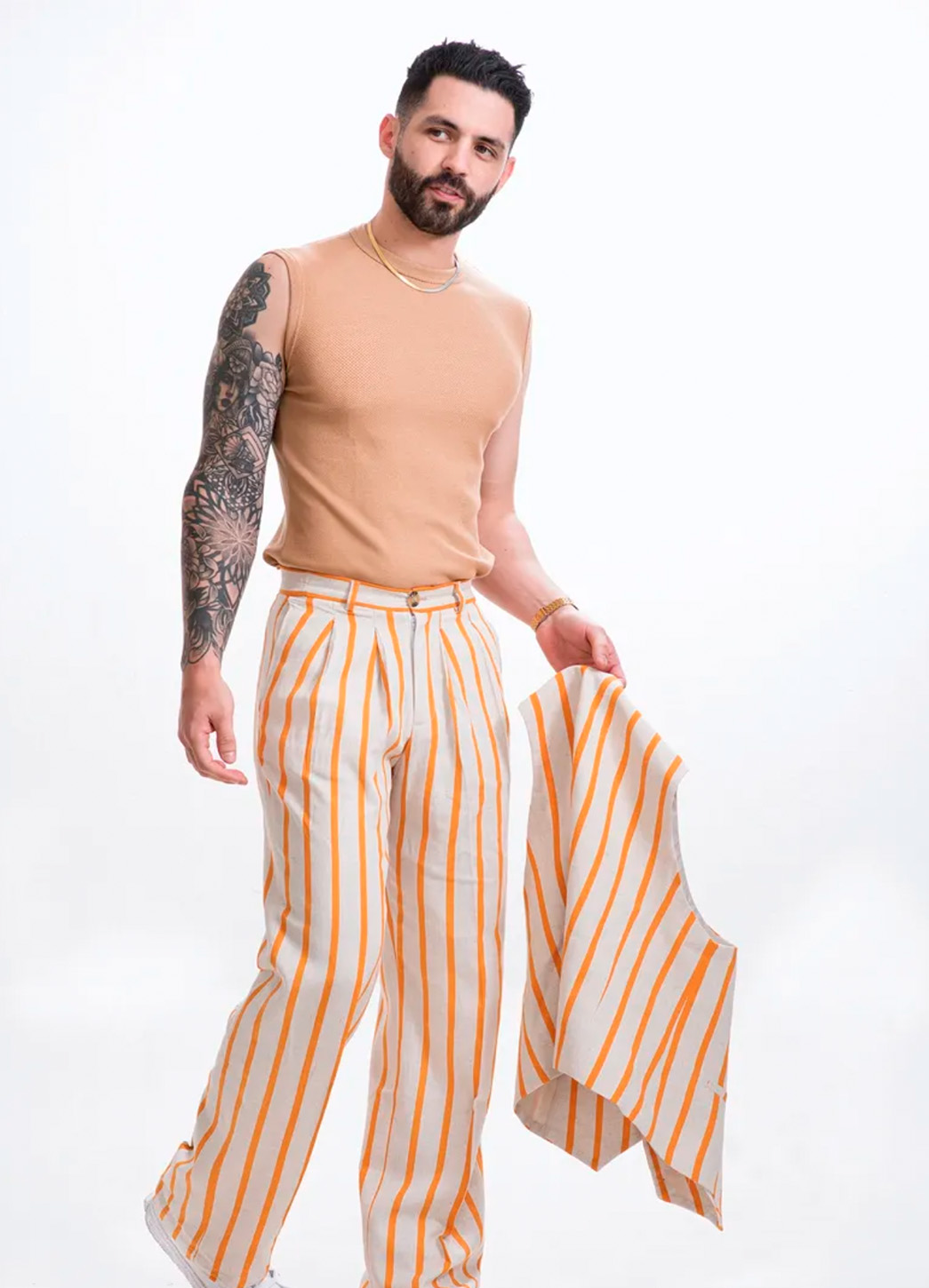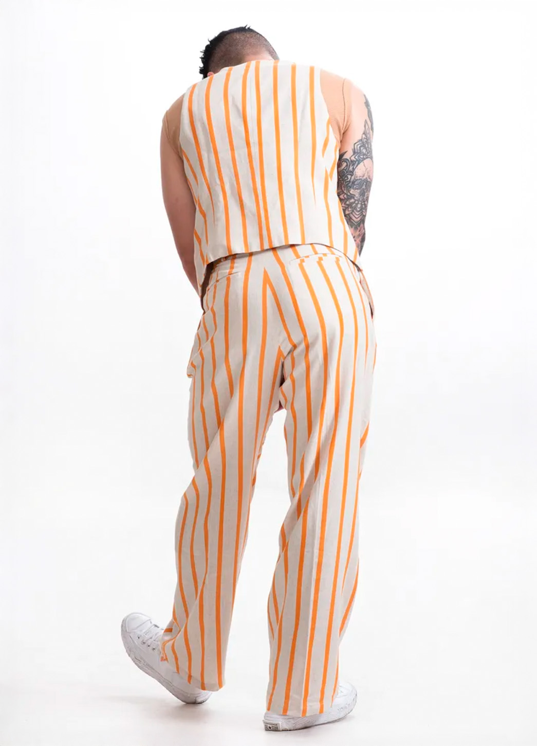 El Conjunto Positano transmite una estética fresca y contemporánea con un enfoque relajado pero bien definido. El pantalón de corte recto presenta un estampado de rayas verticales en tono naranja sobre fondo claro, lo que estiliza la figura y aporta un ritmo visual dinámico. Su caída fluida sugiere un tejido ligero, ideal para climas cálidos y uso prolongado. La pieza superior complementa el conjunto con un diseño sin mangas y el mismo patrón, logrando una armonía visual limpia y coherente.