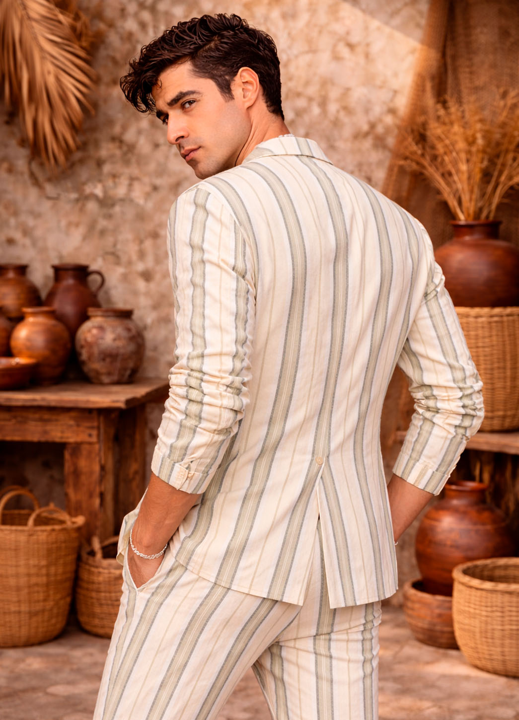 Conjunto Ek´tan Rayas de estética sofisticada y relajada, compuesto por saco ligero de solapa amplia y pantalón de corte recto. El diseño de rayas verticales en tonos neutros aporta una apariencia estilizada y elegante, mientras la caída fluida del tejido brinda movimiento natural.