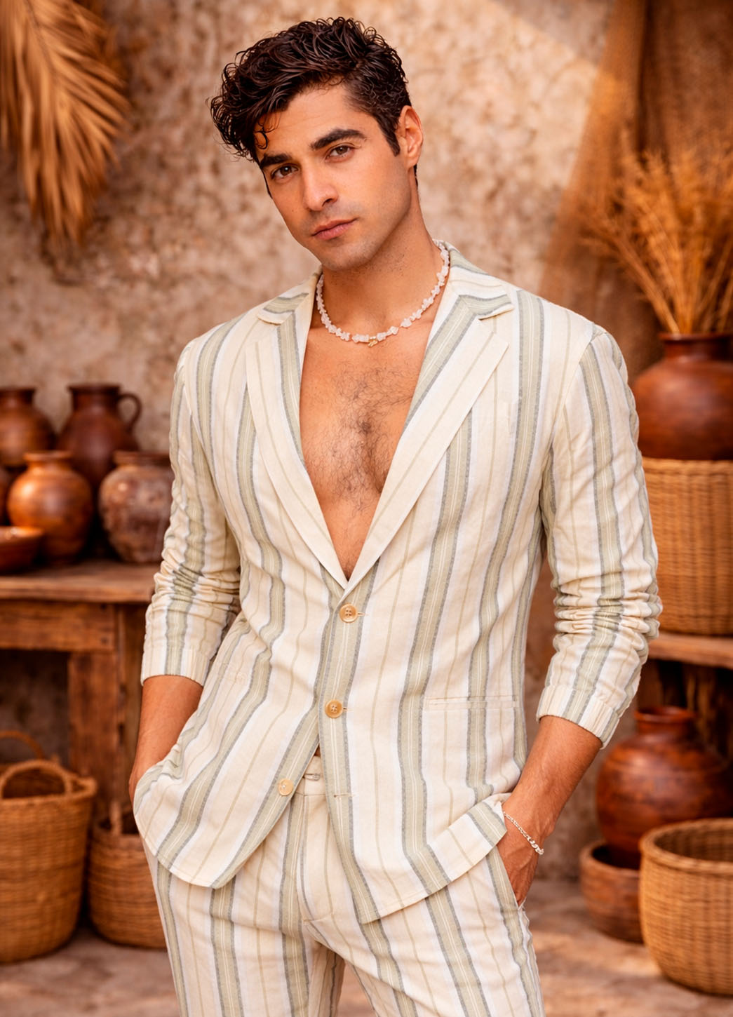 El saco presenta botonadura frontal y ajuste cómodo, ideal para llevar abierto o cerrado. El pantalón mantiene una silueta limpia y versátil, pensado para looks frescos que equilibran comodidad y presencia visual con un estilo contemporáneo y refinado.