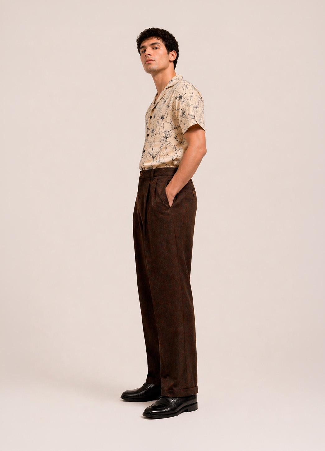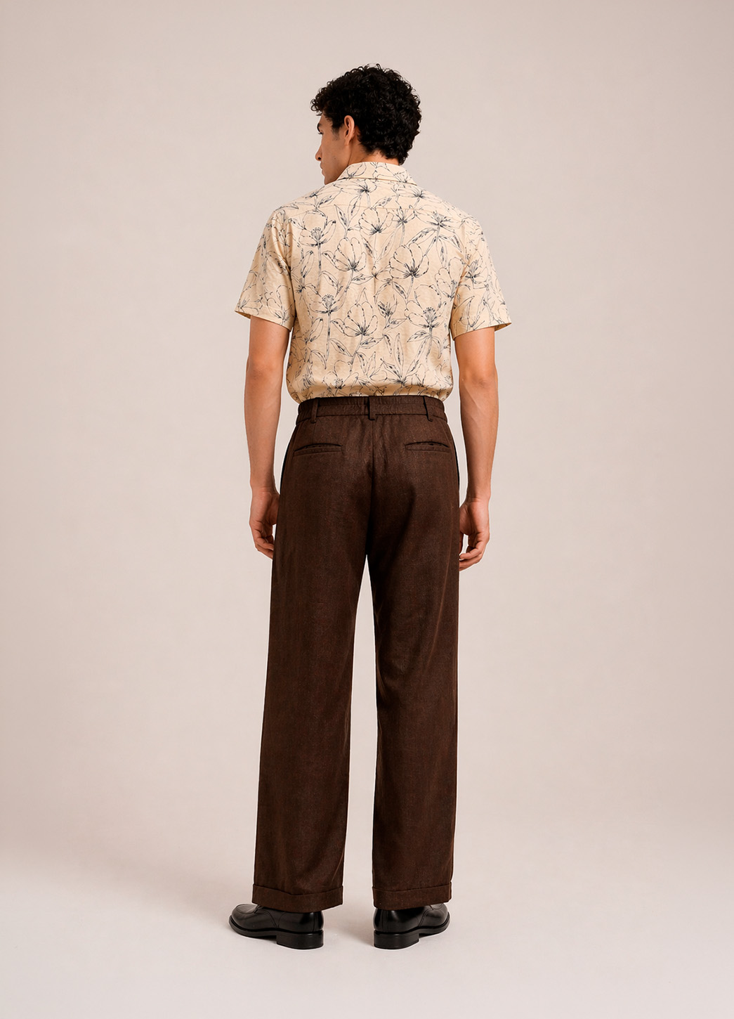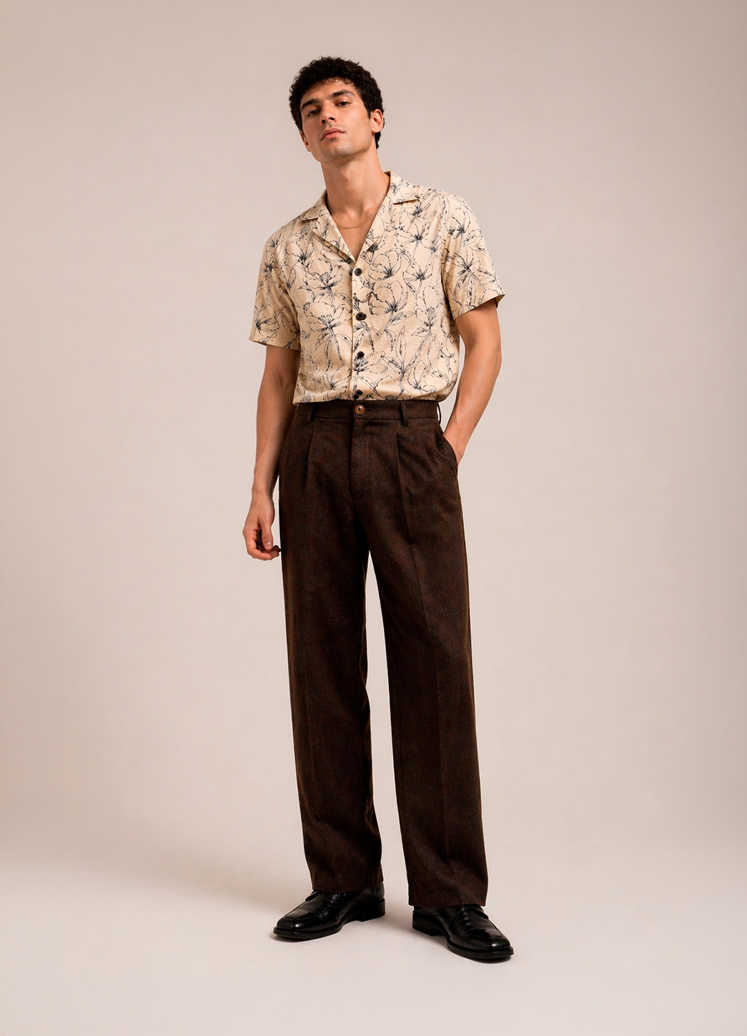 El pantalón Dech combina elegancia y actitud en una silueta amplia de inspiración contemporánea. Su corte recto con pinzas aporta estructura y fluidez, mientras que su acabado en tono café profundo añade sofisticación y versatilidad.