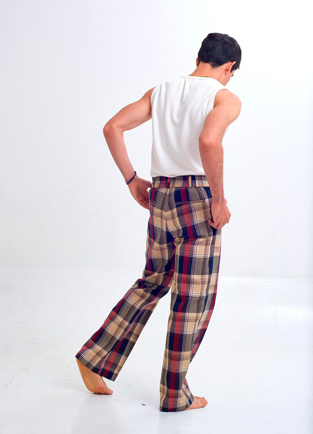 El Pantalón Tartala destaca por su estilo retro-moderno gracias a su diseño a cuadros en tonos beige, rojo y azul marino. Su patrón tartán crea un look llamativo y lleno de personalidad, ideal para quienes buscan destacar con un estilo único y creativo.