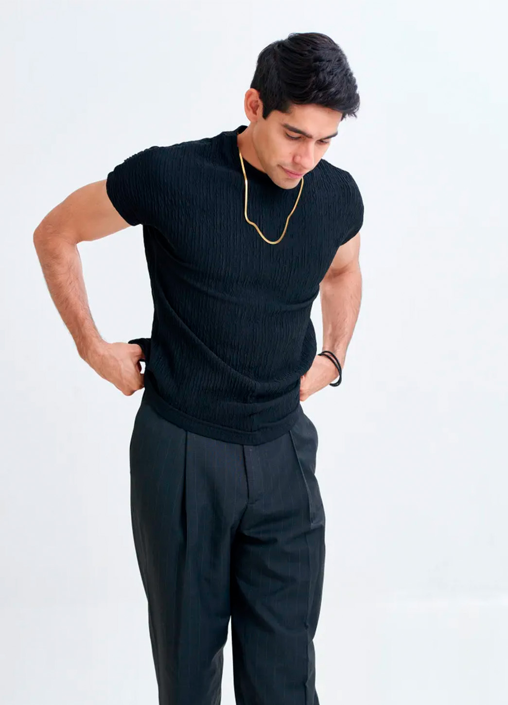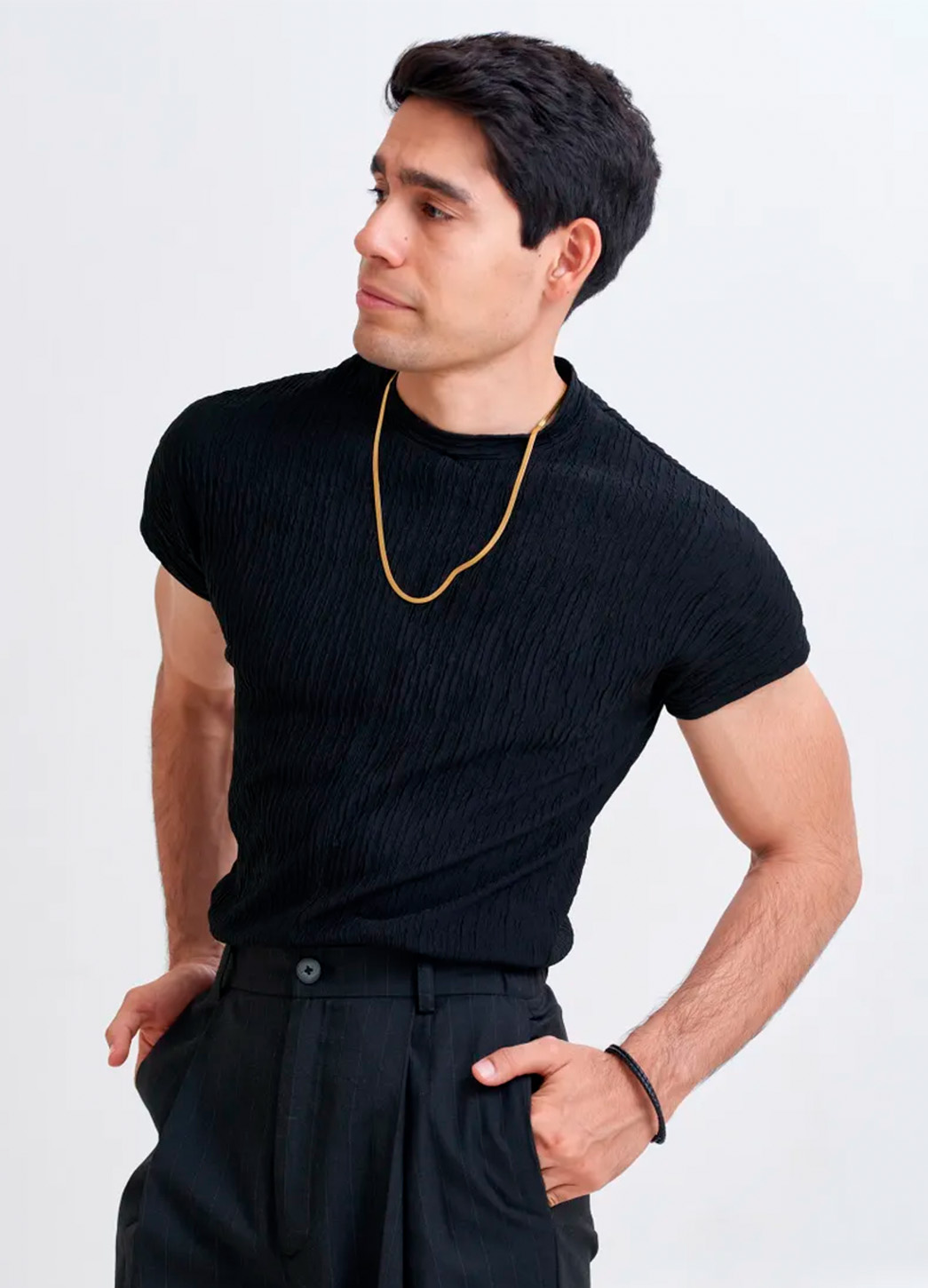 El corte ajustado acentúa la figura sin sacrificar comodidad, mientras que las mangas cortas y el cuello ligeramente alto ofrecen un toque contemporáneo y estilizado. Combinada con pantalón oscuro, como en la imagen, la playera se convierte en una pieza versátil perfecta para outfits urbanos, cenas casuales o looks monocromáticos llenos de carácter. Una prenda diseñada para elevar cualquier conjunto con discreción, estilo y una vibra moderna impecable.