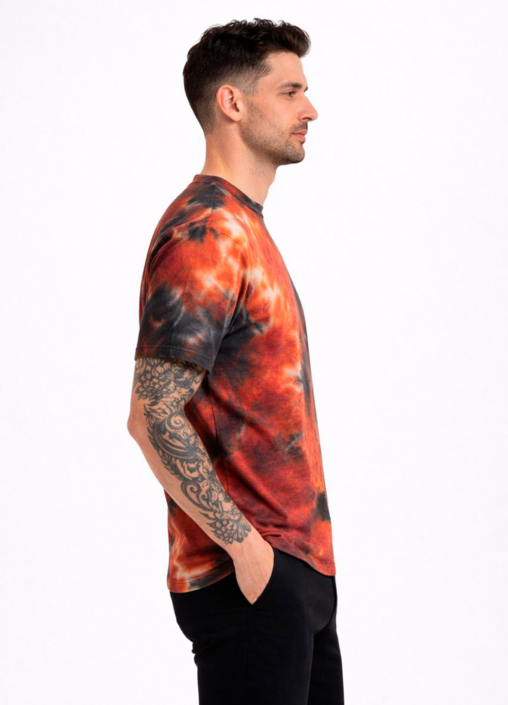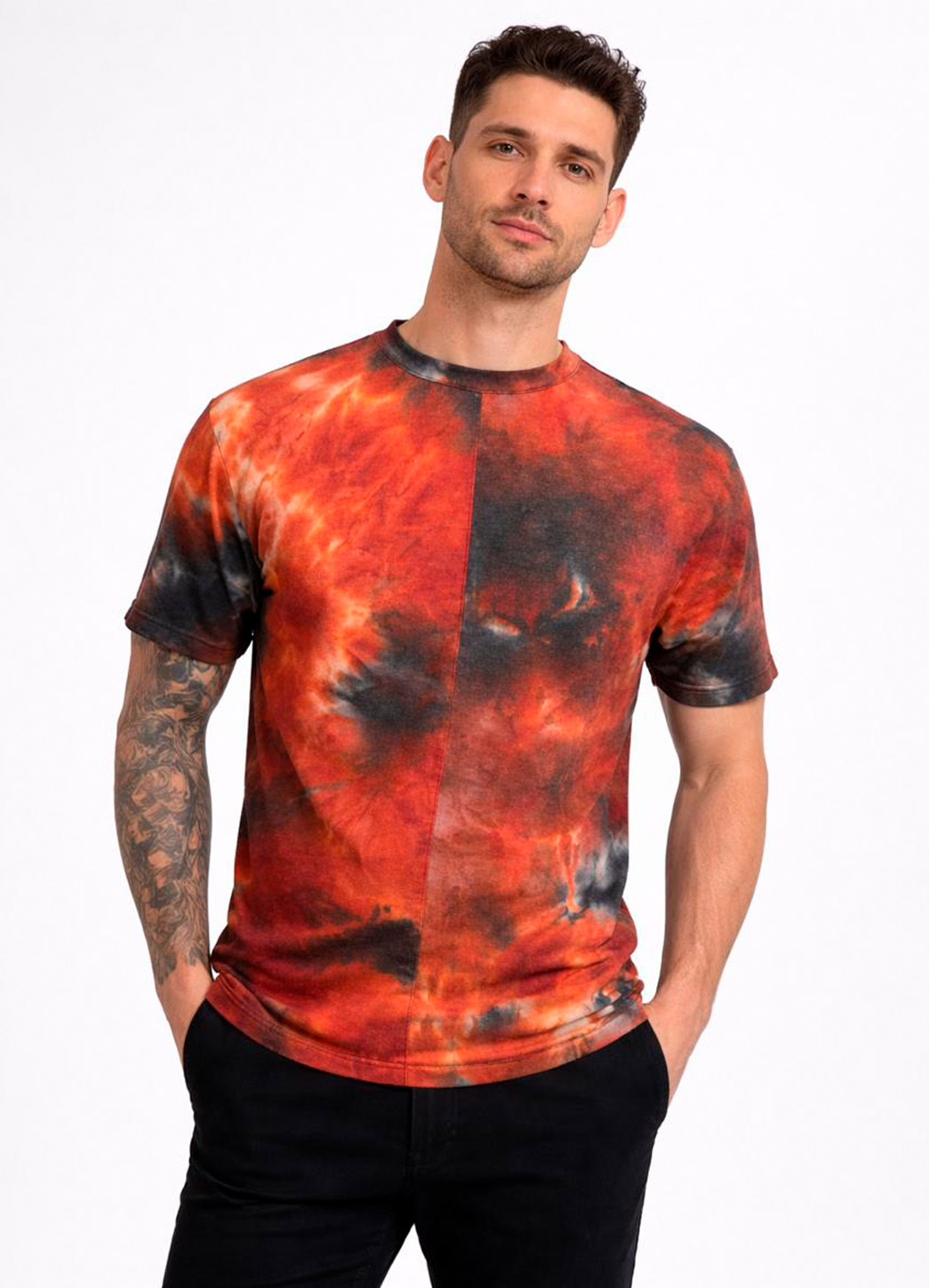 La Playera Cosmos para hombre destaca por su diseño tie dye en tonos intensos rojo, negro y matices degradados que evocan energía y carácter. Confeccionada en tela suave y transpirable, ofrece un ajuste cómodo que se adapta al cuerpo sin limitar el movimiento. Su corte clásico de manga corta y cuello redondo la convierte en una prenda versátil para outfits casuales y urbanos.