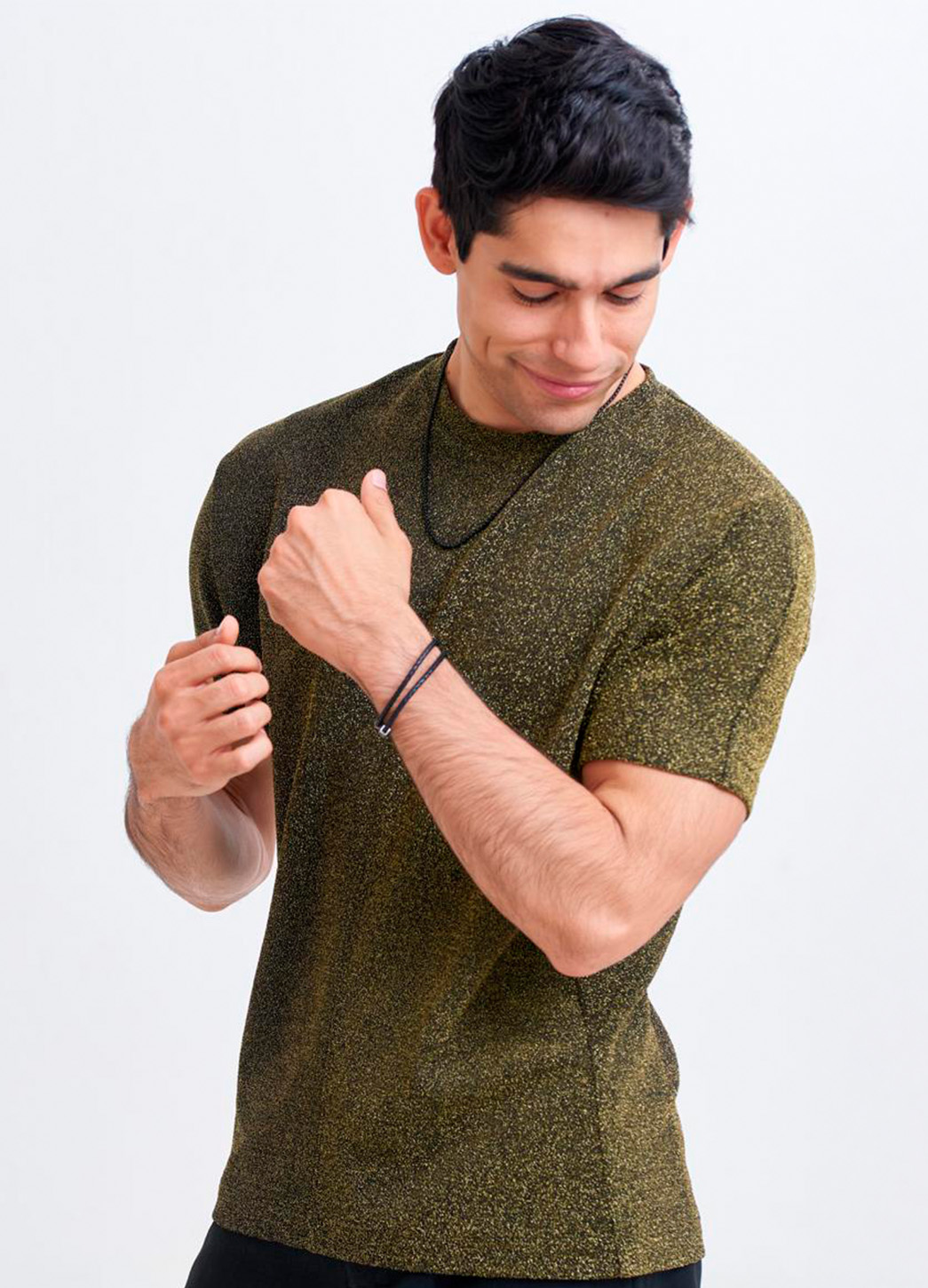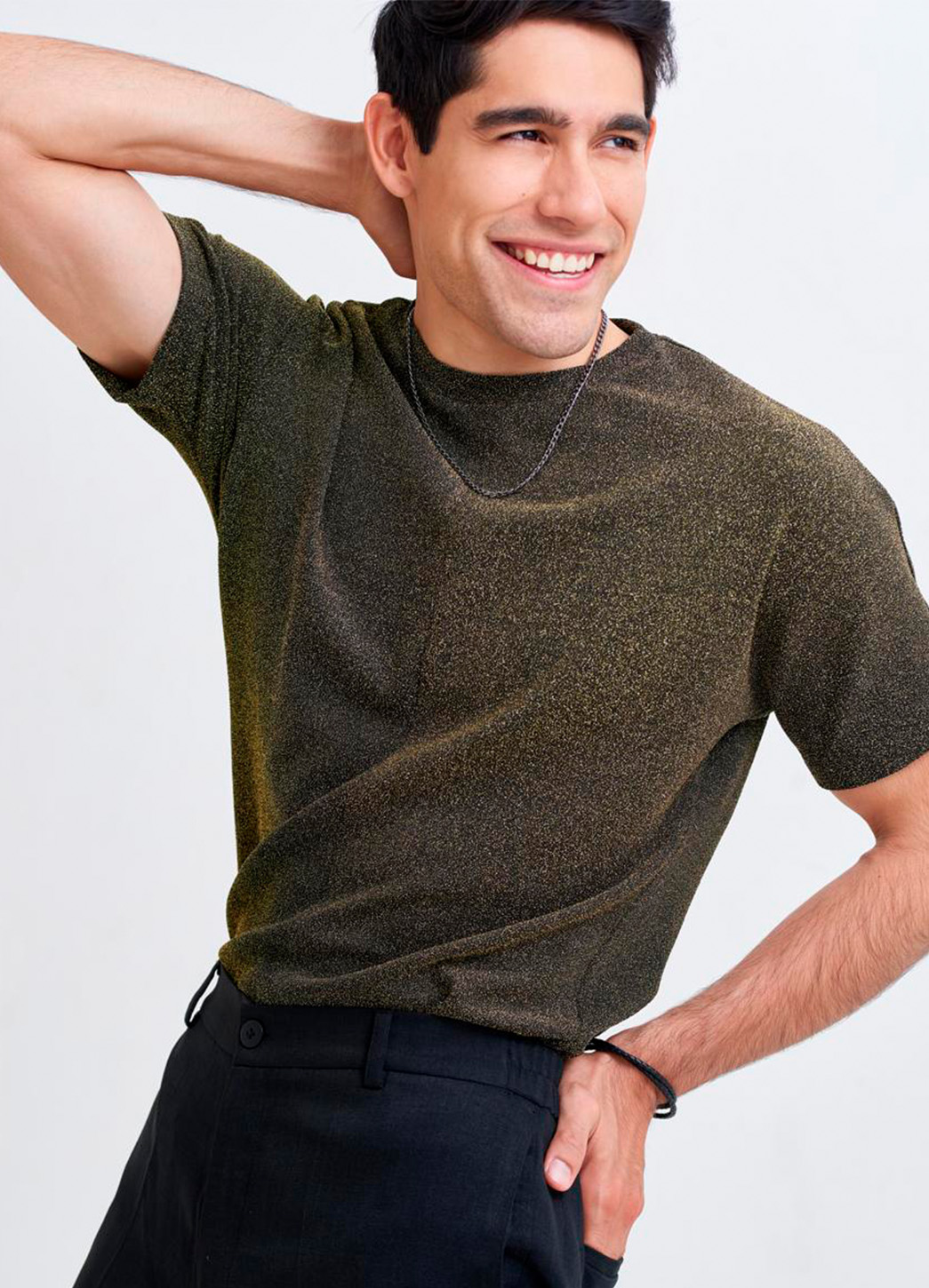 El diseño de manga corta aporta frescura, mientras que el corte clásico mantiene un estilo versátil y fácil de combinar. El contraste con pantalón oscuro, como se muestra en la imagen, resalta aún más el acabado dorado, convirtiendo esta playera en una pieza clave para quienes buscan un toque de personalidad y luminosidad en su outfit. Perfecta para destacar con un estilo único, moderno y lleno de carácter.