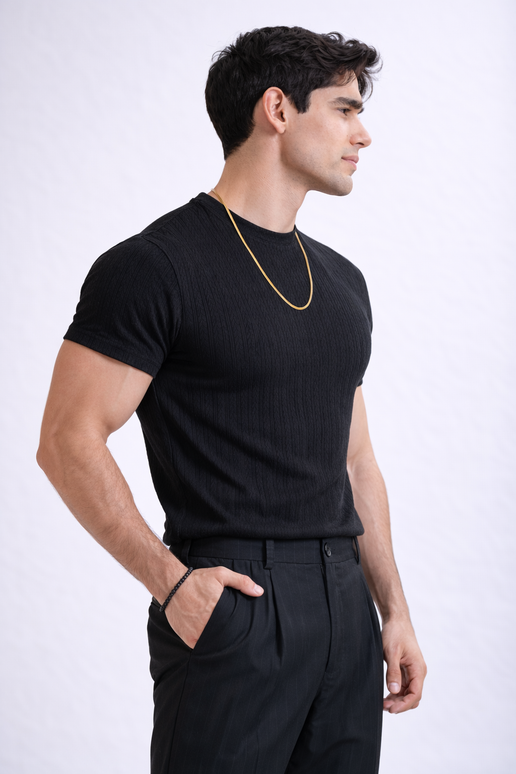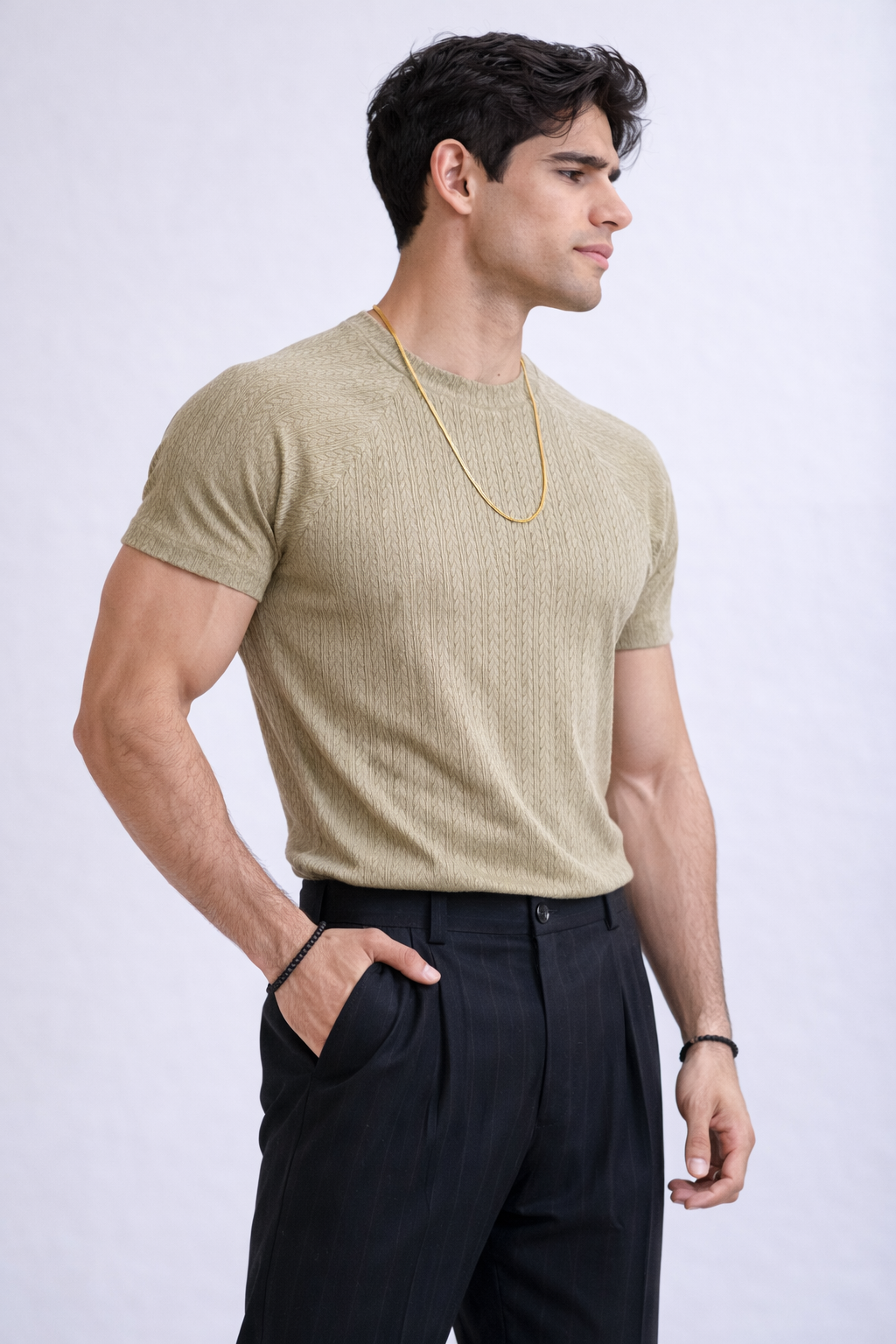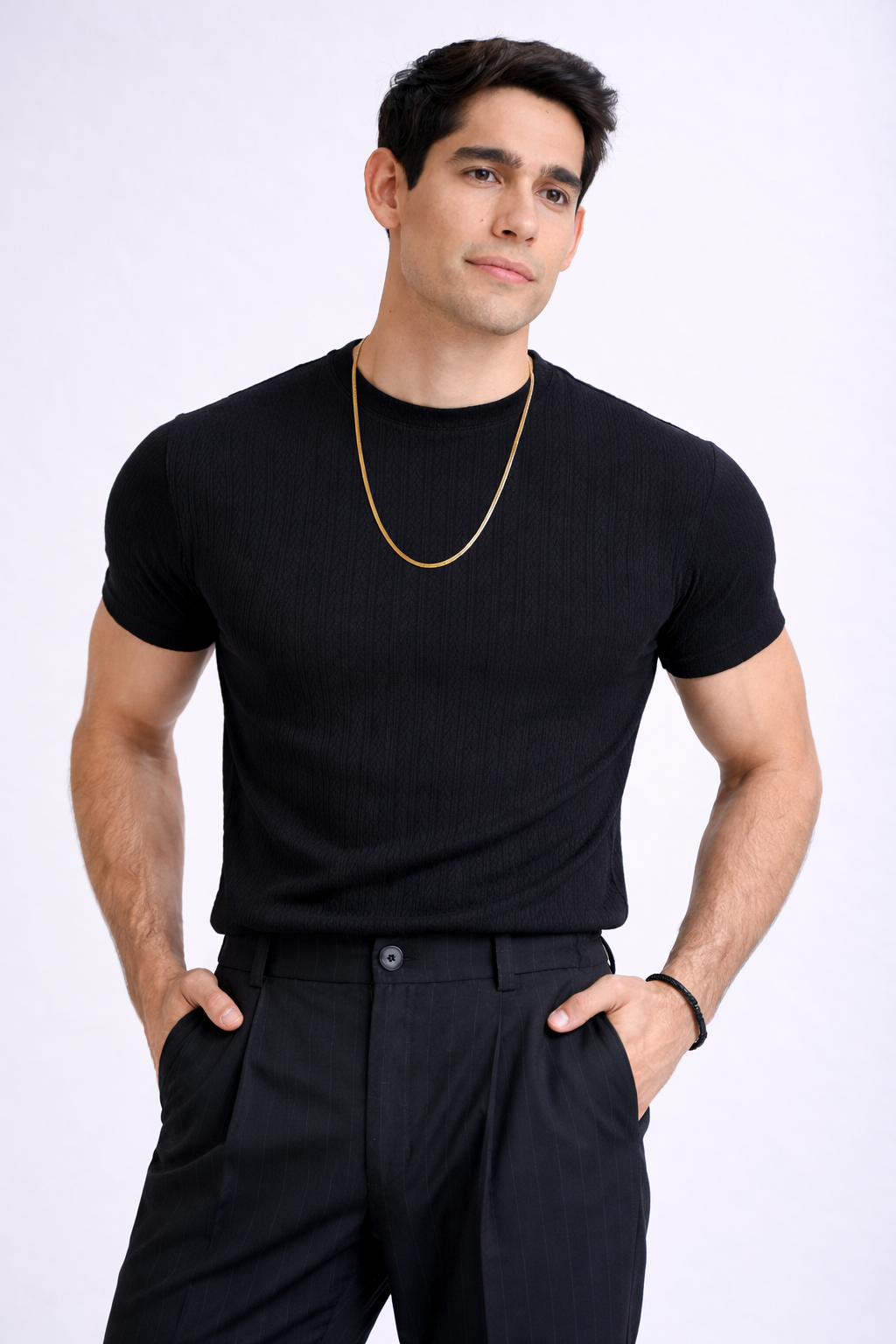 El corte de manga corta la convierte en una prenda versátil para el día a día, perfecta para looks relajados con un toque refinado. El patrón discreto sobre el tejido añade profundidad visual, haciendo que esta playera sea ideal para quienes buscan estilo sin exceso. Combinada con accesorios dorados o pantalones oscuros, se transforma en una pieza moderna, limpia y atemporal, perfecta para elevar cualquier outfit casual.