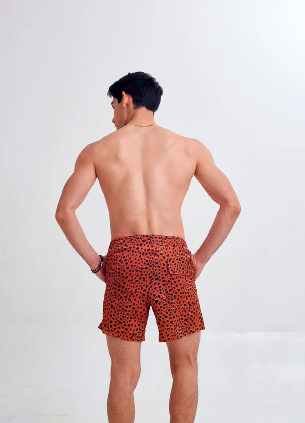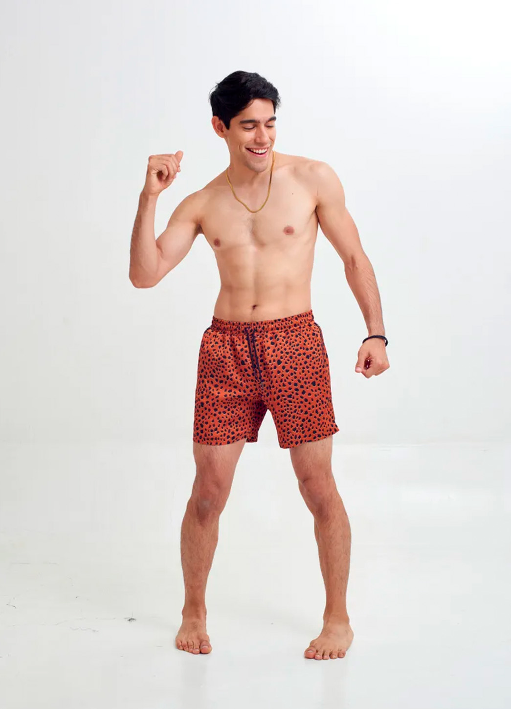 Este traje de baño presenta un diseño moderno y llamativo con fondo rojo terracota y patrón irregular en negro que aporta carácter y estilo. El corte es recto, con largo medio sobre el muslo, permitiendo libertad de movimiento y una silueta equilibrada. Incorpora pretina elástica con ajuste cómodo y cordón frontal visible en contraste, ideal para un calce seguro.