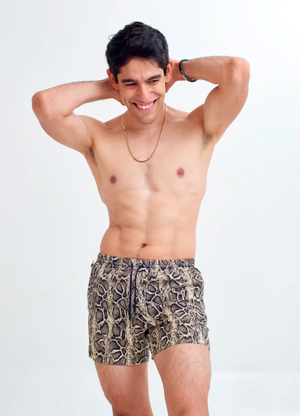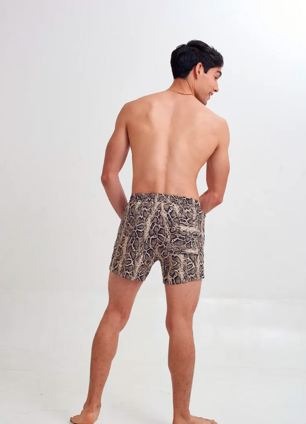 Este traje de baño muestra un estampado tipo piel de serpiente en tonos beige, arena y negro que genera un efecto visual audaz y contemporáneo. El corte es recto y corto, dejando el muslo parcialmente descubierto para una silueta estilizada y fresca. Cuenta con pretina elástica que se adapta al cuerpo y cordón frontal negro visible que permite un ajuste seguro.