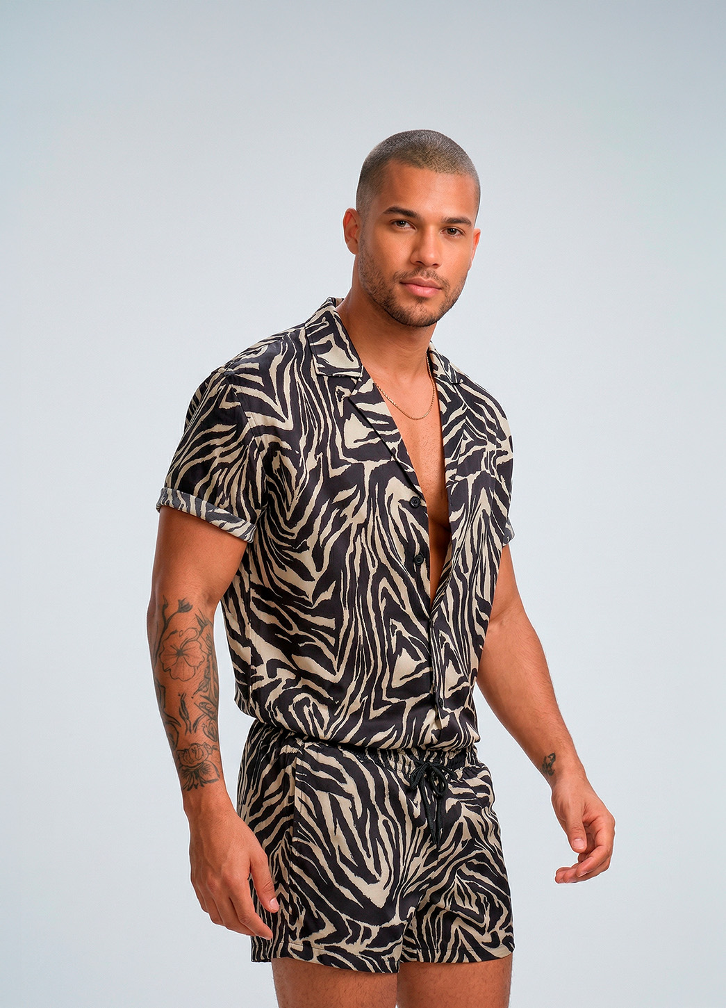 Diseñado para destacar sin esfuerzo, el traje de baño Zebra combina un estampado animal en contraste blanco y negro con un corte corto moderno que estiliza la silueta. Su pretina elástica con cordón ajustable asegura un fit cómodo y seguro, ideal para moverte con libertad dentro y fuera del agua.